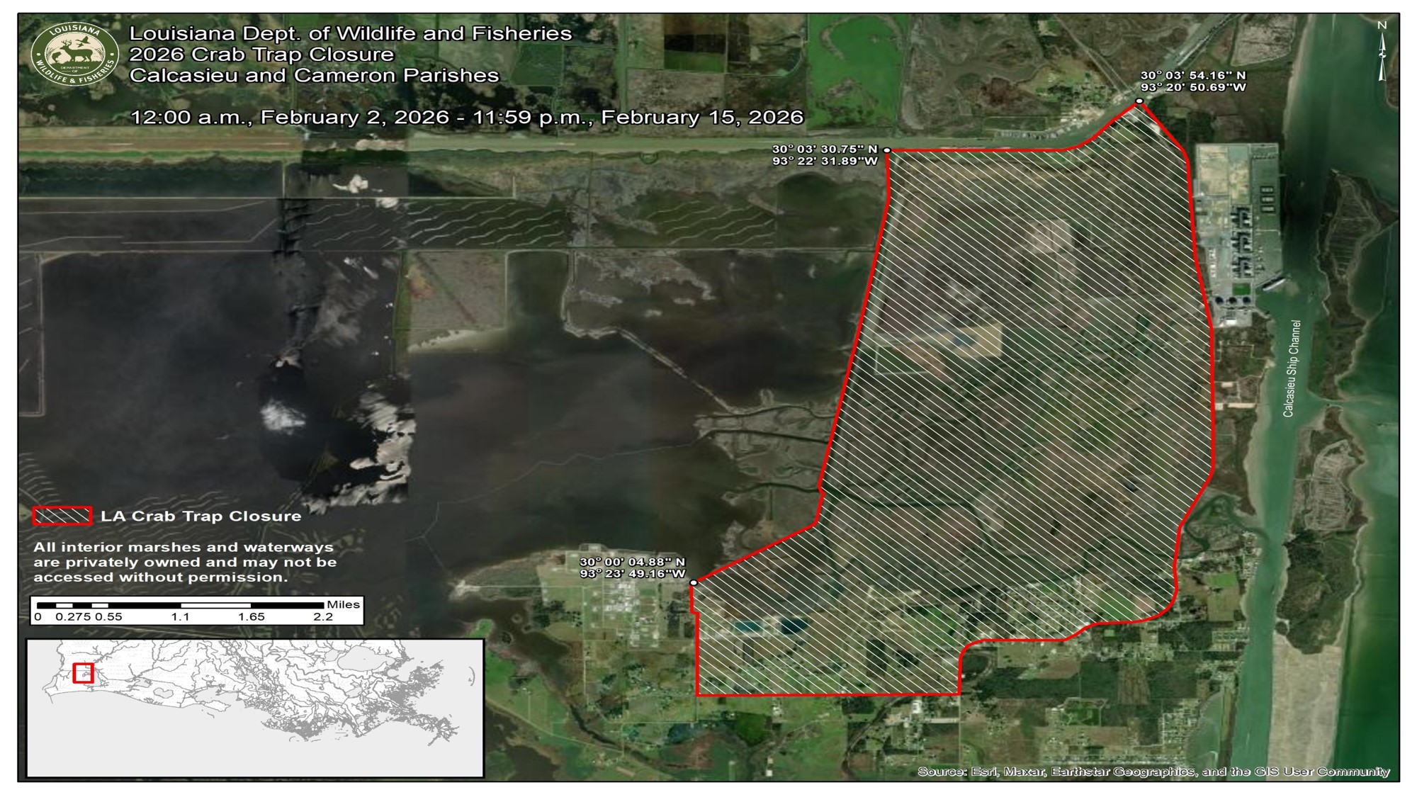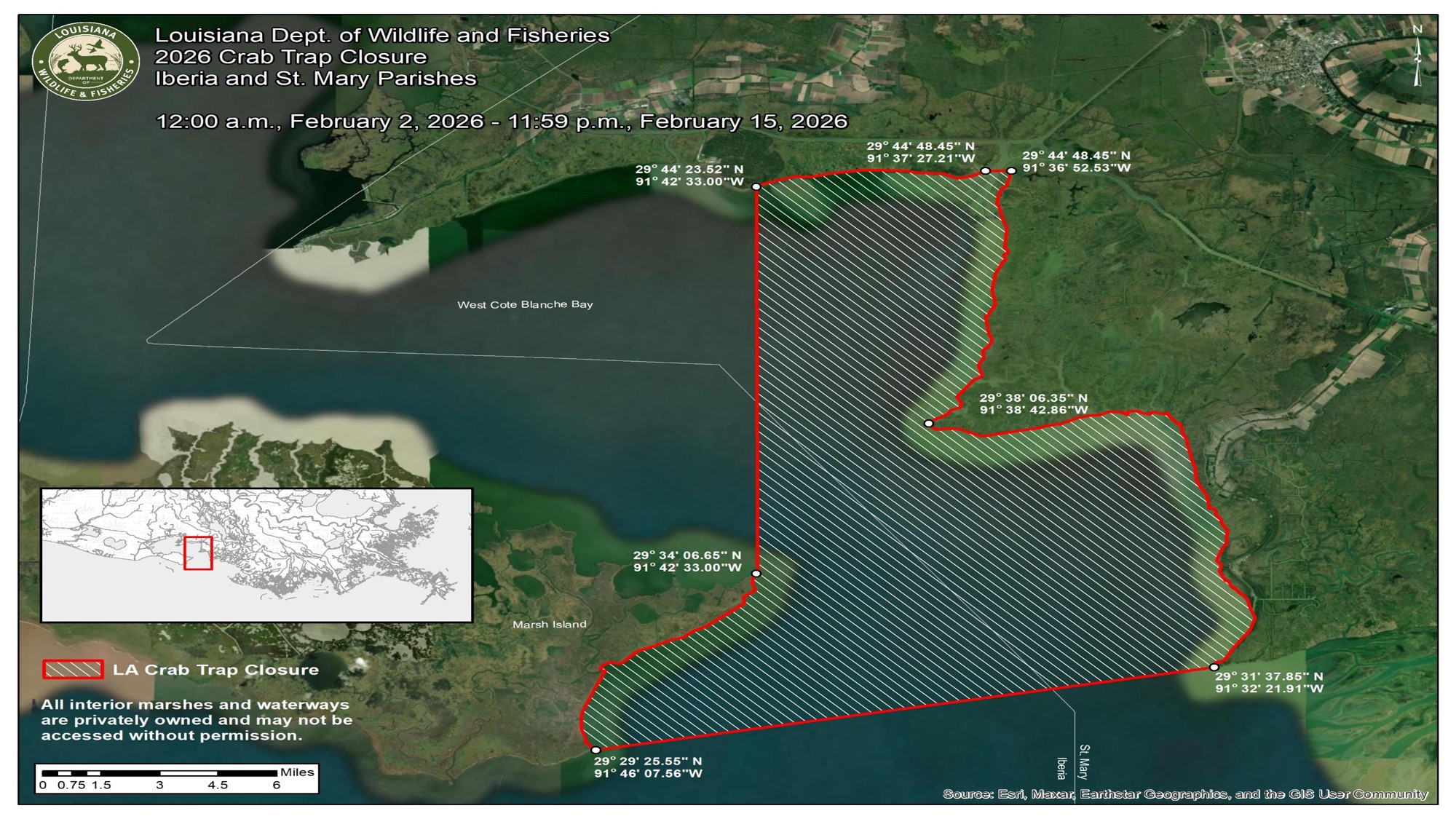 - The second closure will occur in the Vermilion-Teche Basin, all waters east of Marsh Island, from 12:00 a.m. February 2, 2026, through 11:59 p.m. February 15, 2026.