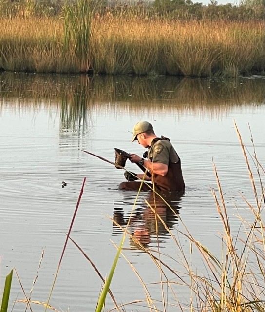 Senior Agent Shea Schexnaydre retrieves a sample of milo and corn from a baited pond.