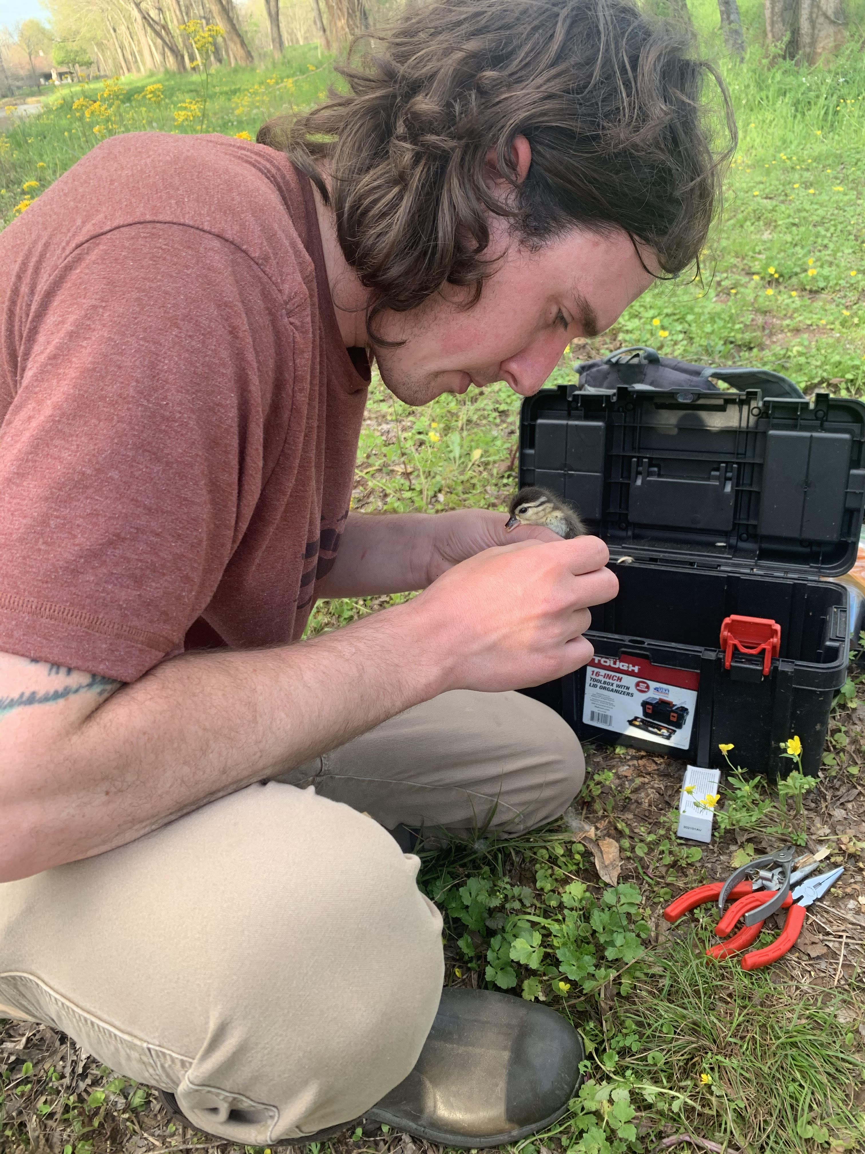 Nesting female wood ducks captured during nest-box checks are banded with standard aluminum leg bands. Ducklings have small metal tags affixed in the webbing between their toes so they may be identified during pre-season banding efforts or after harvest by hunters.