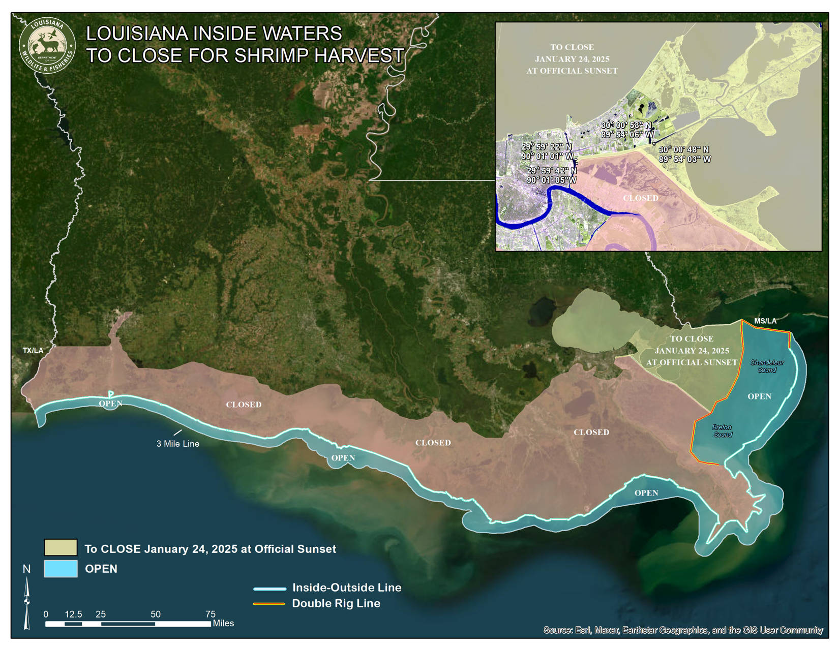 The Louisiana Department of Wildlife and Fisheries announces that the 2024 fall inshore shrimp season will close as follows: