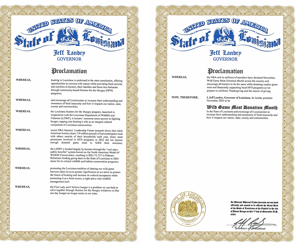 As Louisiana’s deer hunting season begins, Governor Landry asks Louisiana hunters to donate part or all of their harvest to families in need this holiday season. The holidays symbolize a season of giving and showing goodwill towards others. That is why in conjunction with the National Rifle Association (NRA), Governor Landry has declared November, Wild Game Meat Donation Month in Louisiana.