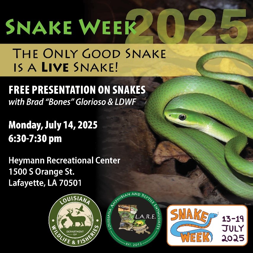 The Louisiana Amphibian and Reptile Enthusiasts (LARE), along with the Louisiana Department of Wildlife and Fisheries (LDWF), will hold a seminar on snakes at the Heymann Recreational Center in Lafayette (1500 S. Orange St., Lafayette, LA 70501) on Monday (July 14) from 6:30-7:30 p.m.