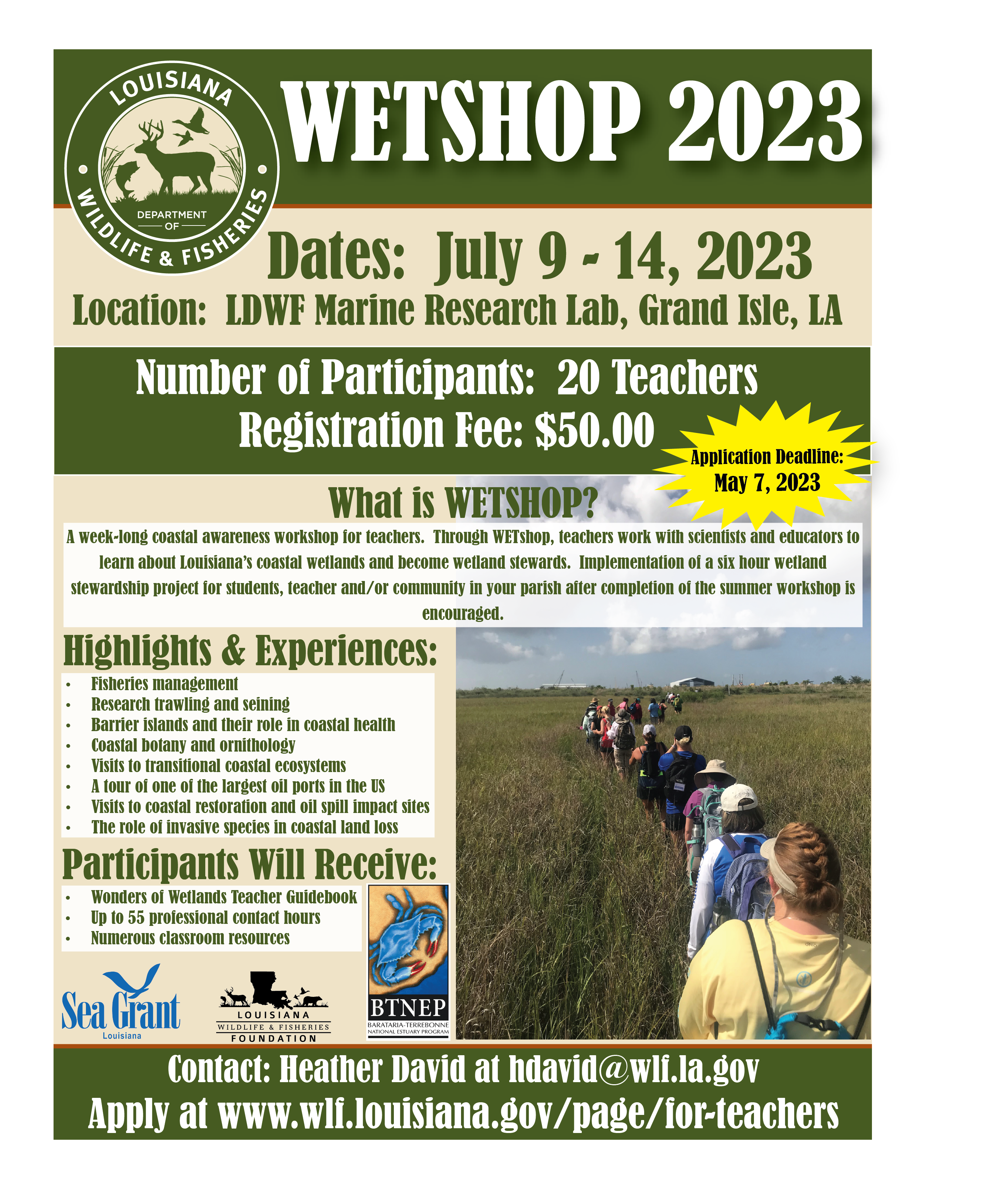 Teachers interested in WETSHOP 2023 can visit https://www.wlf.louisiana.gov/page/for-teachers or contact Heather David at hdavid@wlf.la.gov with questions.