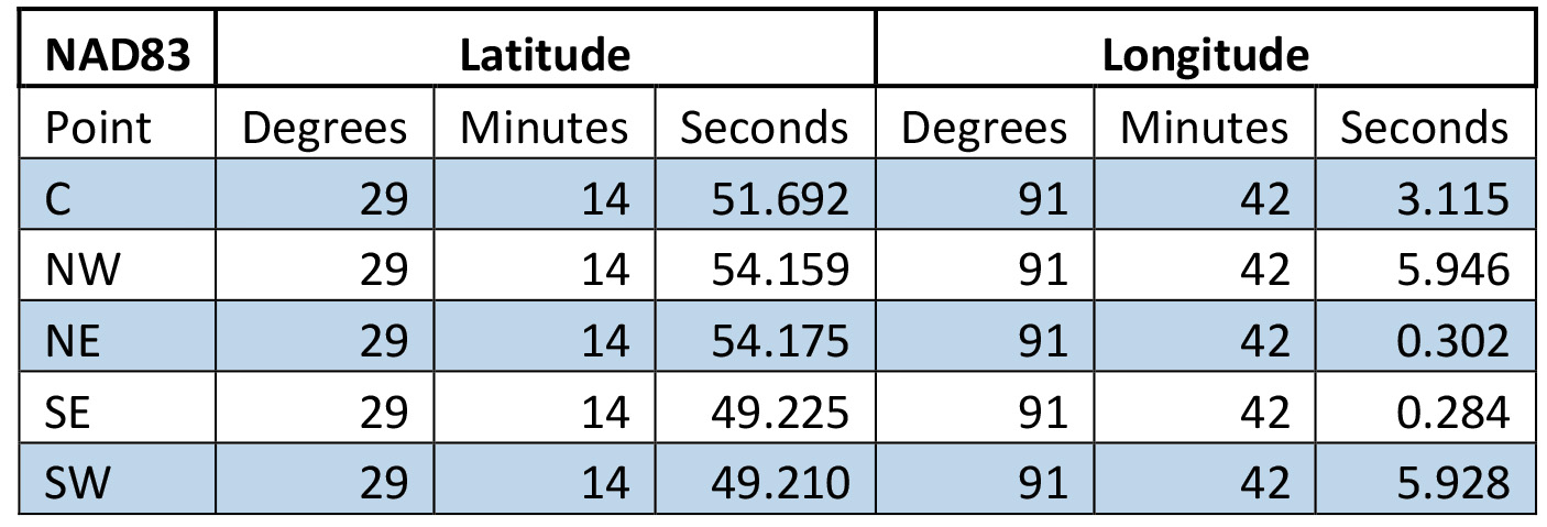 The new deployment, also in partnership with CCA Louisiana, is expected to occur in early November. This deployment will add 465 Cajun Coral reef modules (concrete shapes 3’ long by 1.5’ wide by 1’ tall). Designed by technology company Natrx, Cajun Coral is a highly flexible module that is printed and installed by Danos. The technology promotes habitat growth and ecological benefits that strengthen over time. These reef modules will be deployed within the following coordinates adjacent to the 2022 reef and within the permitted area: