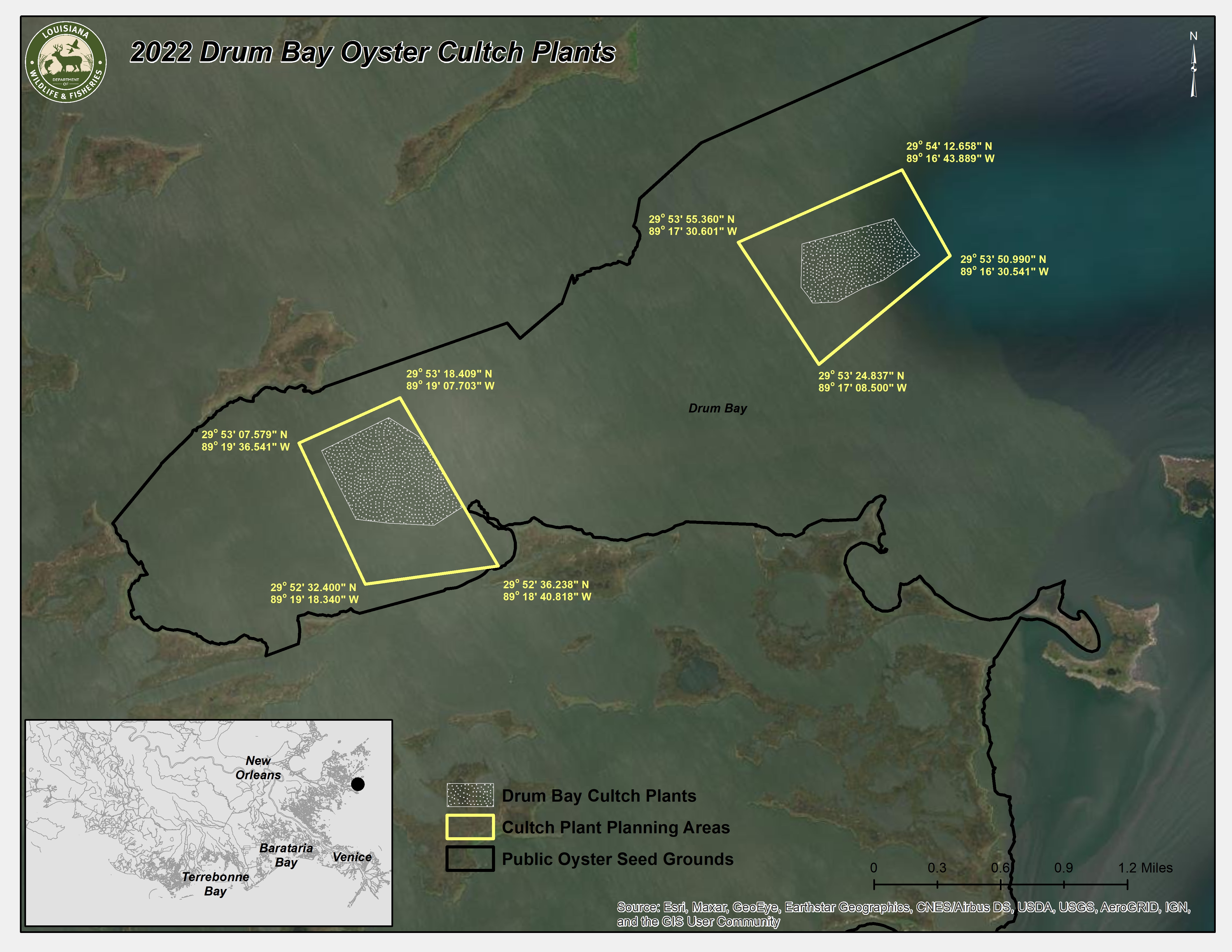 The Louisiana Department of Wildlife and Fisheries (LDWF) has completed the construction of two oyster reefs totaling approximately 230 acres in Drum Bay (St. Bernard Parish) to increase oyster habitat and fisheries production. The construction process, known as cultch planting, is a proven habitat improvement technique used by LDWF.