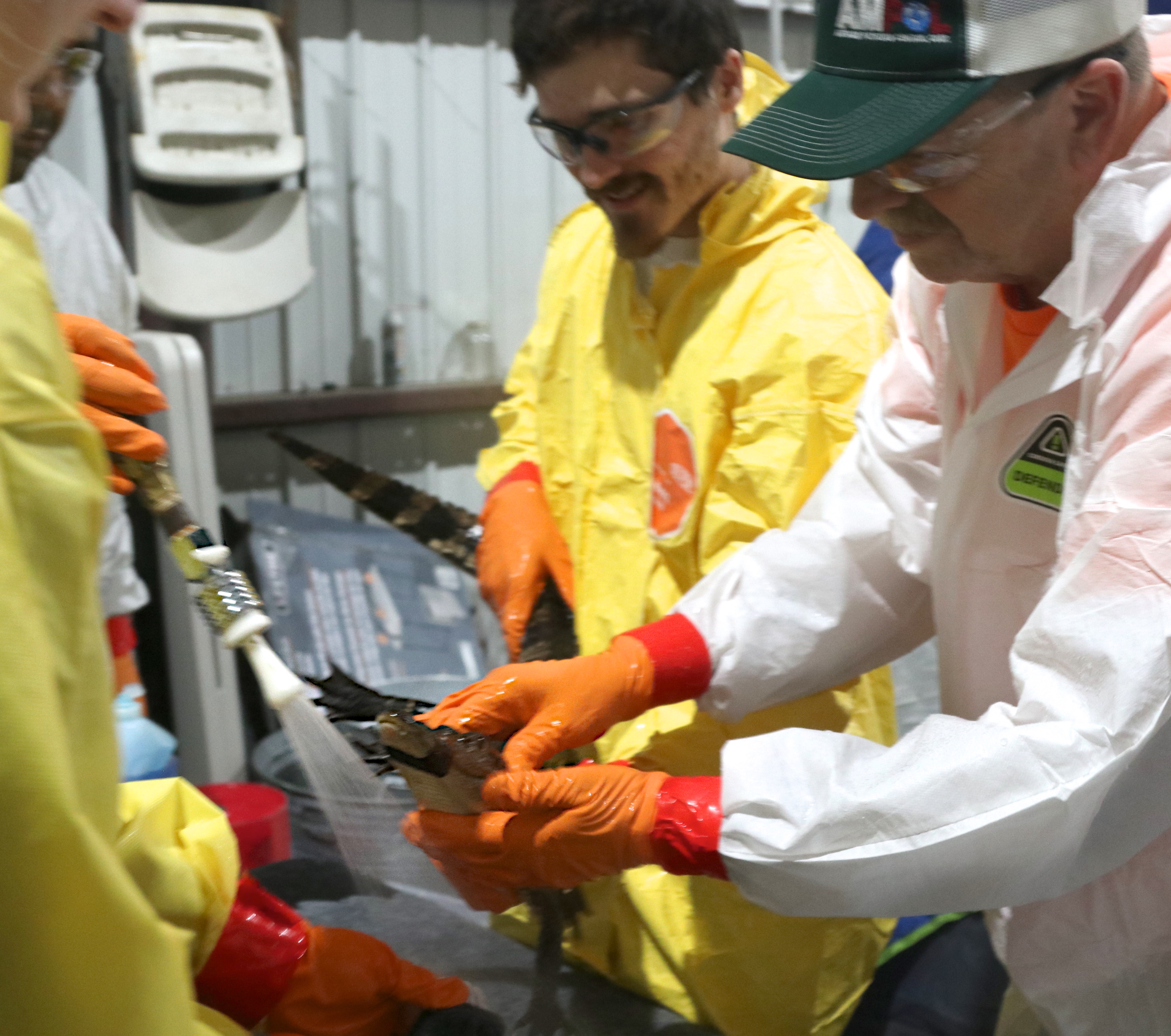 Wildlife rehabilitators wash diesel fuel off alligator.