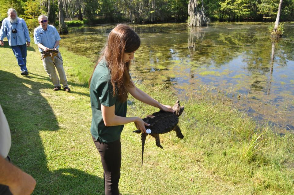 Photo 2 – LDWF Natural Heritage Program Manager Amity Bass prepares to release an alligator snapping turtle at Sam Houston Jones State Park.