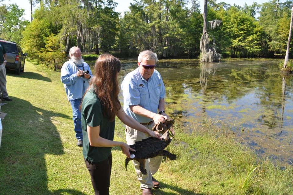 Photo 3 – LDWF Natural Heritage Program Manager Amity Bass and LDWF Secretary Robert Barham prepare to release alligator snapping turtles at Sam Houston Jones State Park.
