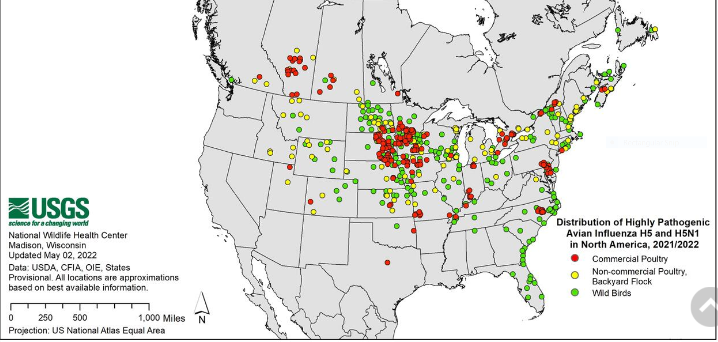 HPAI is affecting wild birds and domestic poultry across much of North America, primarily in the Midwest and along the Atlantic Coast of the U.S. The U.S. Department of Agriculture’s Animal and Plant Health Inspection Service and other agencies have detected bird flu in wild birds in 34 states, the closest in Texas and Alabama, and in commercial and backyard poultry flocks in 29 states.