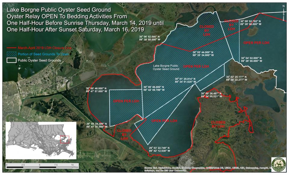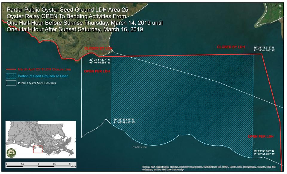 The season will reopen for bedding purposes in the Public Oyster Seed Grounds in Lake Borgne (St. Bernard Parish), a portion of Mississippi Sound (St. Bernard Parish) and a portion of the Atchafalaya Bay (St. Mary Parish) Public Oyster Seed Grounds, within areas designated by the Louisiana Department of Health Areas 1, 2, and 25. This opening is for bedding purposes only and will begin at one half-hour after sunrise on Thursday, March 14, 2019, and will close at one half-hour after sunset on Saturday, March 16, 2019.