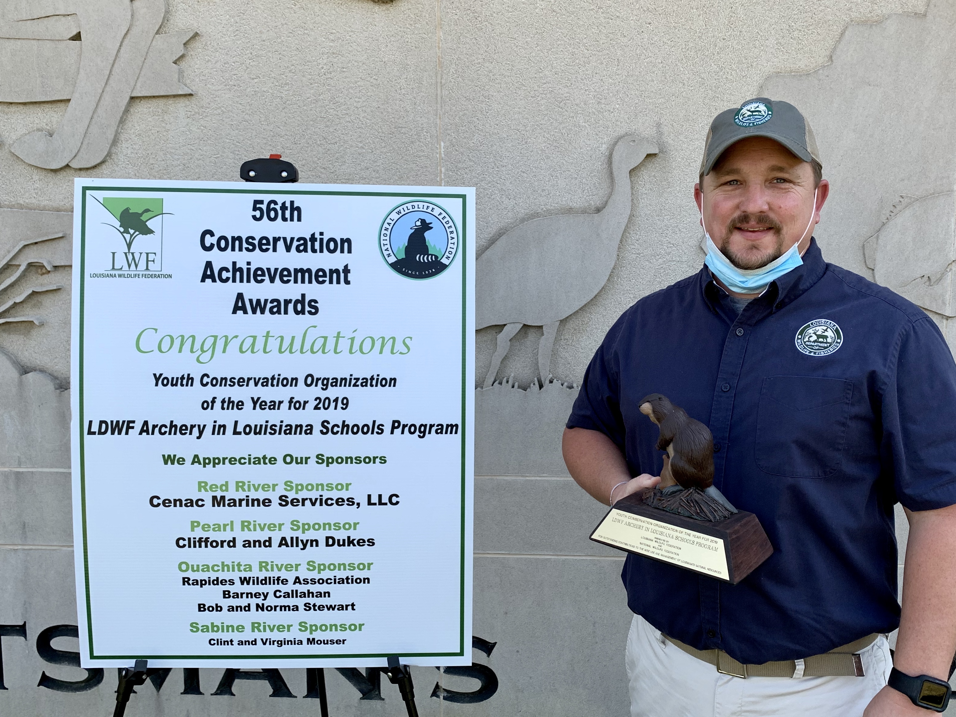 LDWF's Chad Moore, who oversees the Archery in Louisiana Schools program, with the 2019 Youth Conservation Organization award.