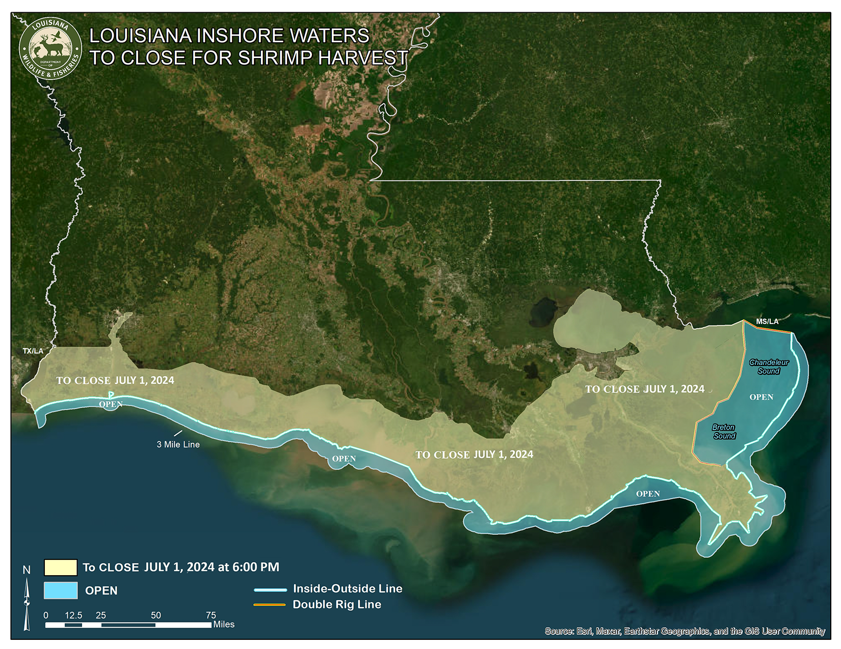 The Louisiana Department of Wildlife and Fisheries announced the 2024 spring inshore shrimp season will close at 6 p.m. on Monday, July 1, 2024, in all state inside waters from the Mississippi/Louisiana state line westward to the Louisiana/Texas state line.