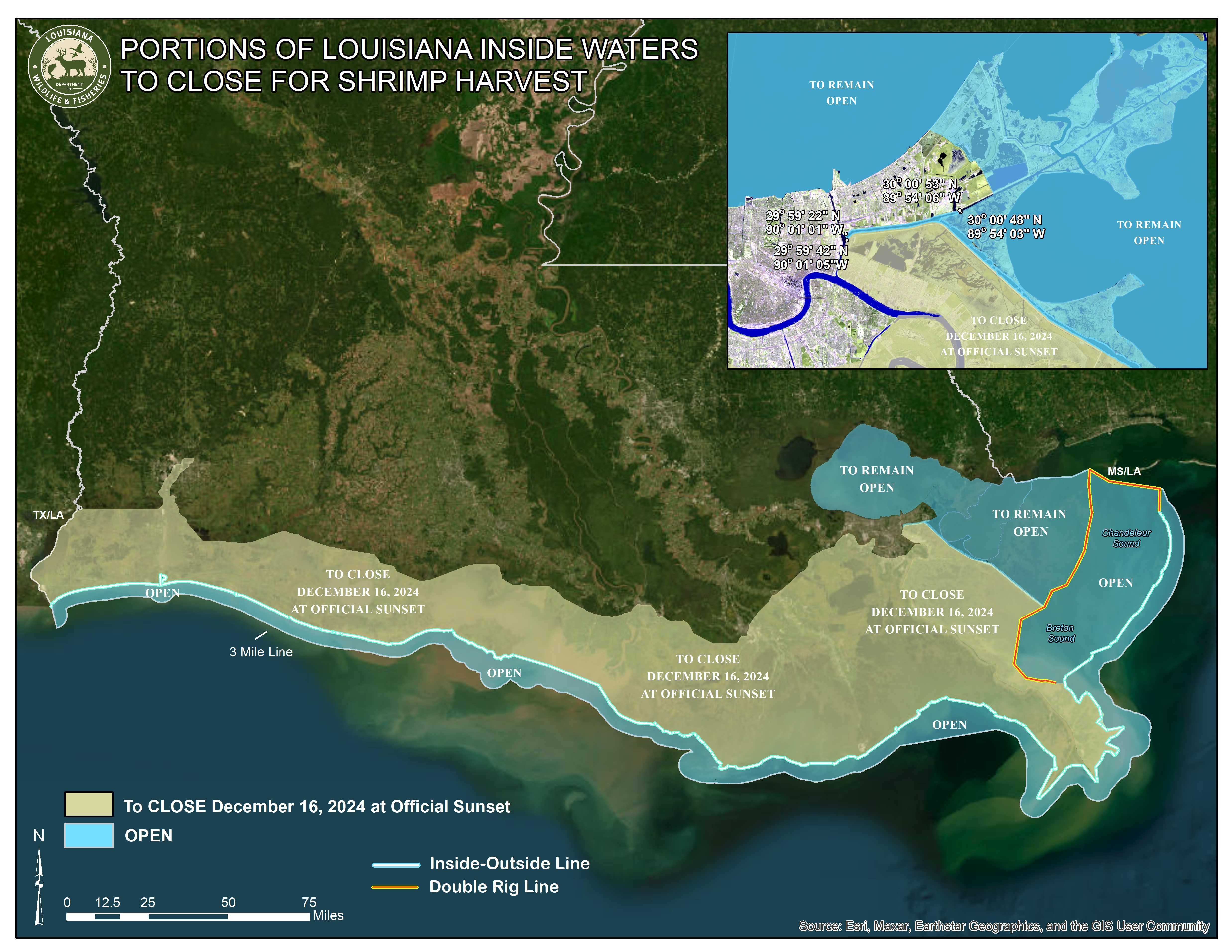 The Louisiana Department of Wildlife and Fisheries announces that the 2024 fall inshore shrimp season will close as follows: