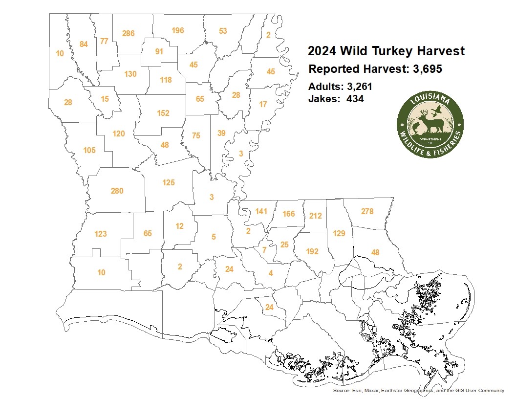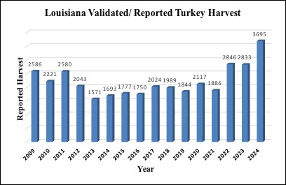 Louisiana’s turkey hunters enjoyed the best year by far from a harvest standpoint in 2024 as they reported taking 3,695 birds during the recently completed season, according to Louisiana Department of Wildlife and Fisheries (LDWF) reported harvest data.