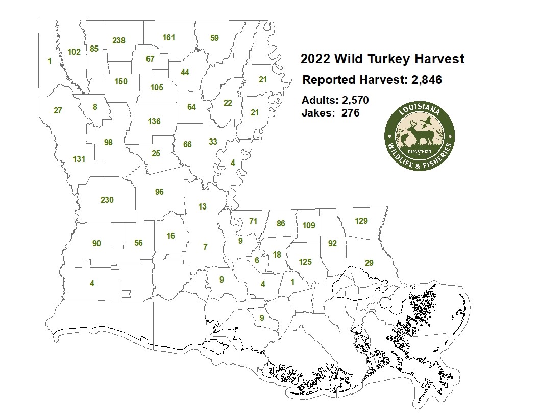 The 2022 Louisiana turkey harvest was the best since harvest reporting began in the state in 2009, the Louisiana Department of Wildlife and Fisheries announced, with hunters taking 2,846 birds compared to 1,886 in 2021, an improvement of 50.9 %.