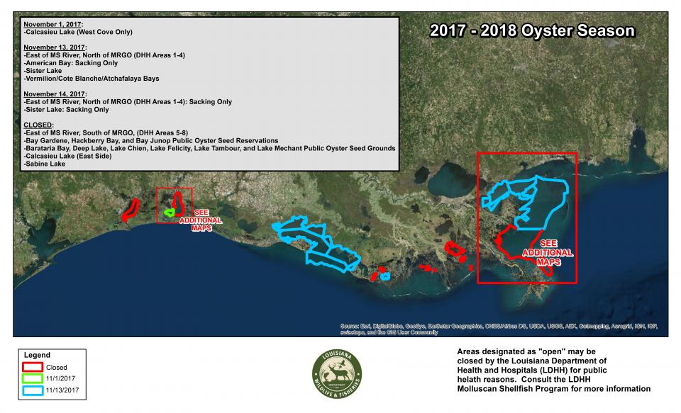 - Monday, November 13, 2017 - all Public Oyster Seed Grounds east of the Mississippi River, north of the Mississippi River Gulf Outlet (DHH Shellfish Harvest Areas 1-4), Bay Long/American Bay sacking-only area, Sister Lake, and the Vermilion/East and West Cote Blanche Bay/Atchafalaya Bay Public Oyster Seed Grounds will open at one half-hour before sunrise