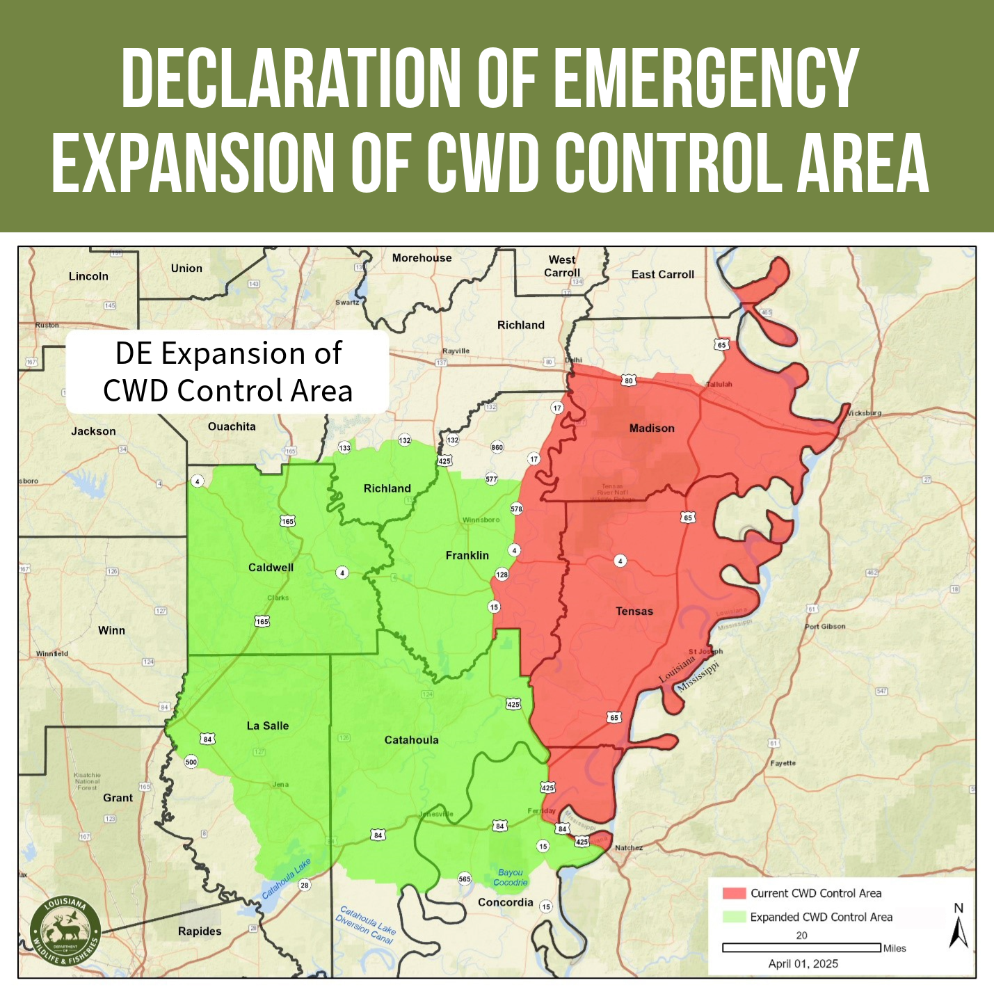 Consistent with LDWF’s CWD protocols, the DE expands the previously established CWD Control Area to include an area comprised of a 25-mile radius from the Catahoula index case. The new control area includes portions of Caldwell, Richland, La Salle and Catahoula parishes. All of Tensas Parish and portions of East Carroll, Madison, Franklin and Concordia parishes were included in the original control area. In addition, the control area will be expanded in Franklin and Concordia parishes.