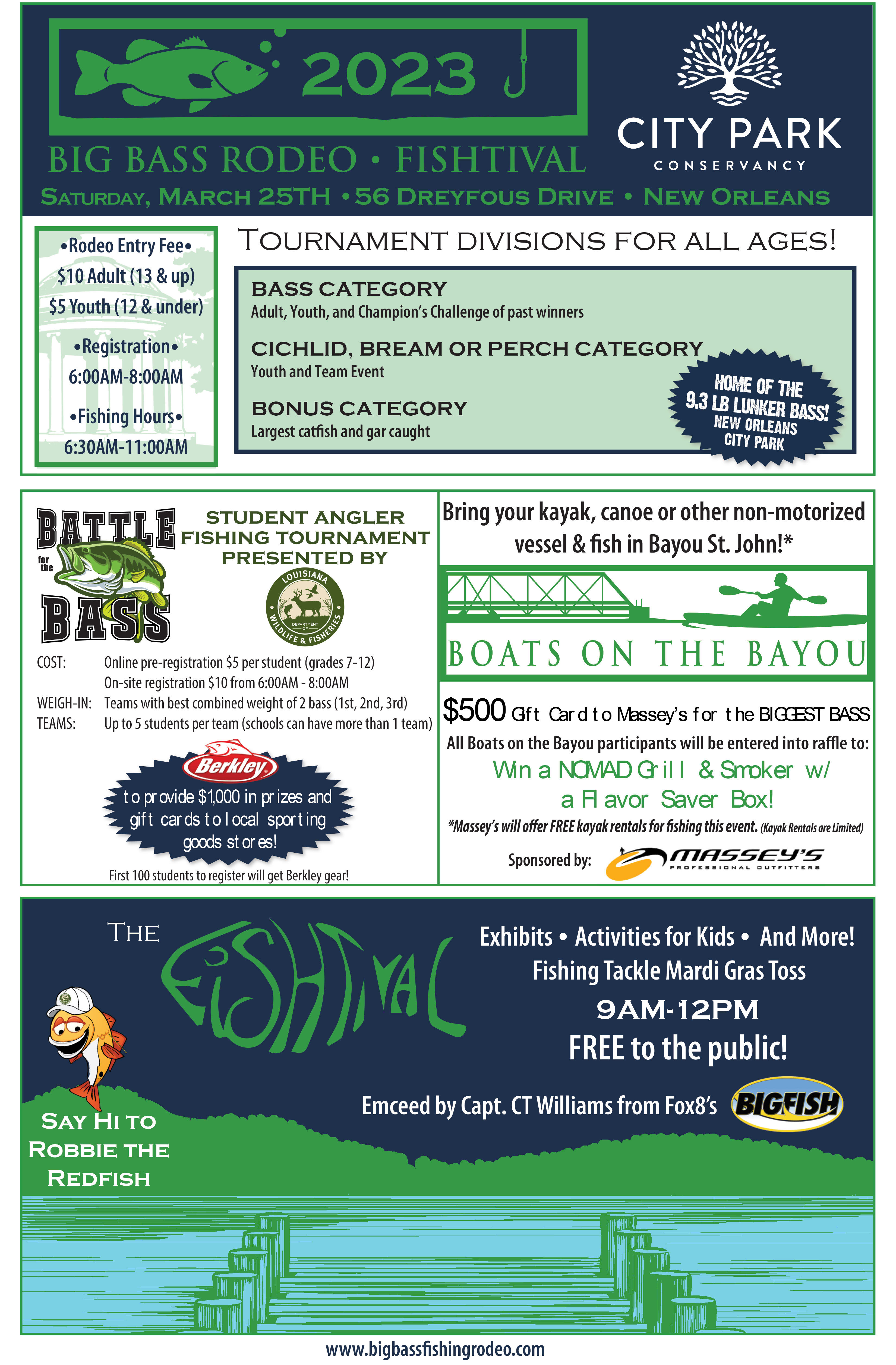 The Louisiana Department of Wildlife and Fisheries (LDWF) and New Orleans City Park Conservancy are hosting the 74th annual Big Bass Rodeo and Fishtival in New Orleans City Park on Saturday, March 25. There’s still time to sign up for the oldest rodeo in the nation with a fishing category for every age and a FREE, family-friendly Fishtival. The day also includes the Battle for the Bass, a student fishing tournament, and Boats on the Bayou – a kayak and non-motorized vessel tournament on Bayou St. John.