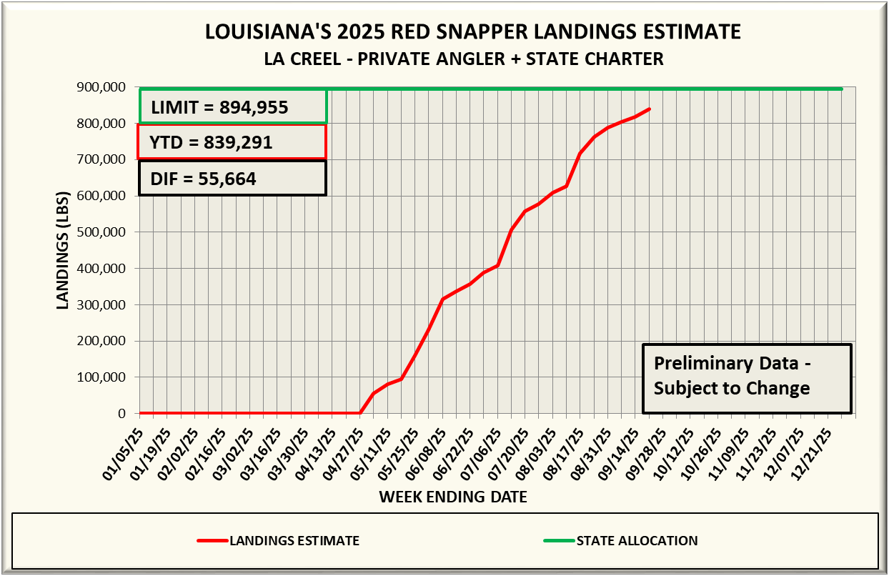 Today, the Louisiana Department of Wildlife and Fisheries (LDWF) released the Red Snapper landings estimate through September 21, 2025. LA Creel, LDWF's near real-time landings data collection program, indicates that 839,291 pounds, or 93.8%, of Louisiana's 2025 annual private recreational allocation of 894,955 pounds has been landed.