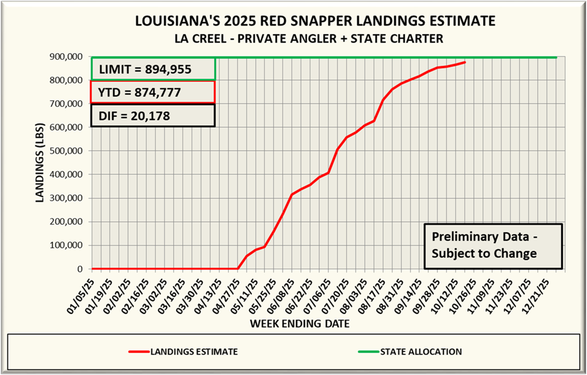 Today, the Louisiana Department of Wildlife and Fisheries (LDWF) released the Red Snapper landings estimate through October 19, 2025. LA Creel, LDWF's near real-time landings data collection program, indicates that 874,777 pounds, or 97.8%, of Louisiana's 2025 annual private recreational allocation of 894,955 pounds has been landed.