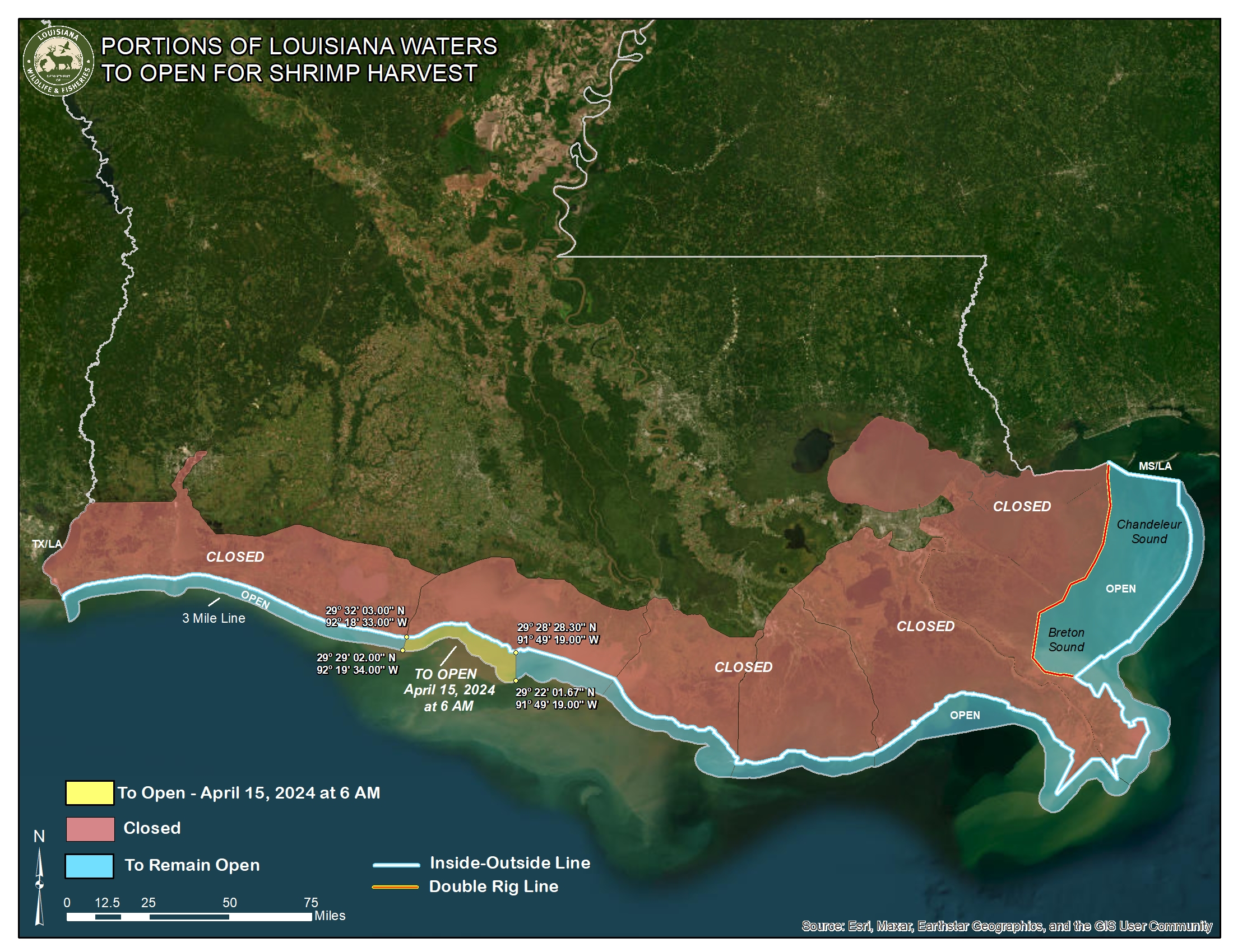 The Louisiana Department of Wildlife and Fisheries announced that the portion of state outside waters between Mound Point on Marsh Island and Freshwater Bayou Canal will reopen to shrimping at 6:00 a.m. on April 15, 2024.