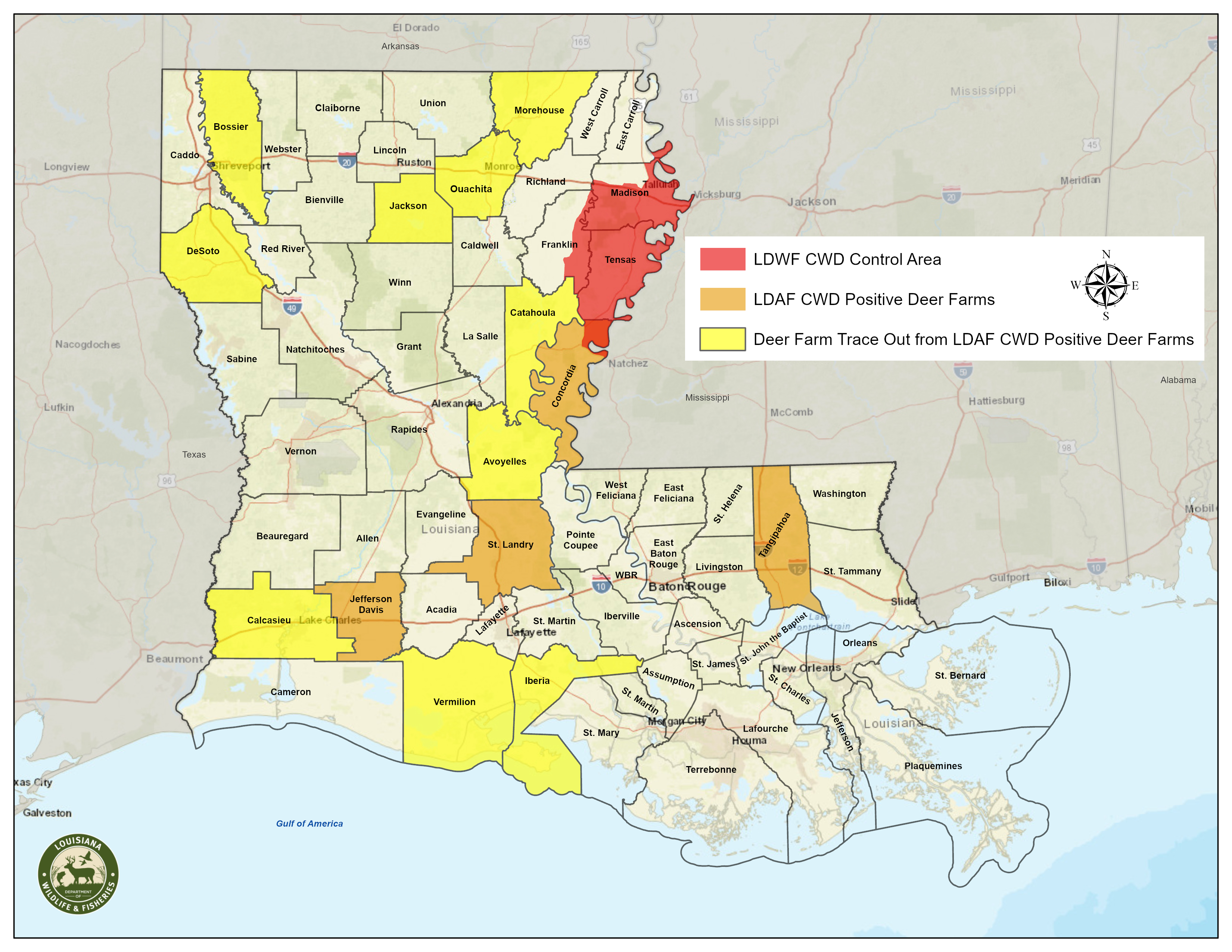 The Louisiana Department of Wildlife and Fisheries (LDWF) is alerting the public of three additional chronic wasting disease (CWD) positive captive deer in pens permitted by the Louisiana Department of Agriculture and Forestry (LDAF). The recent detections in Concordia, St. Landry and Tangipahoa parishes are linked to trace outs from a captive CWD positive deer pen in Jefferson Davis Parish, where CWD was first confirmed in a captive deer back in November.