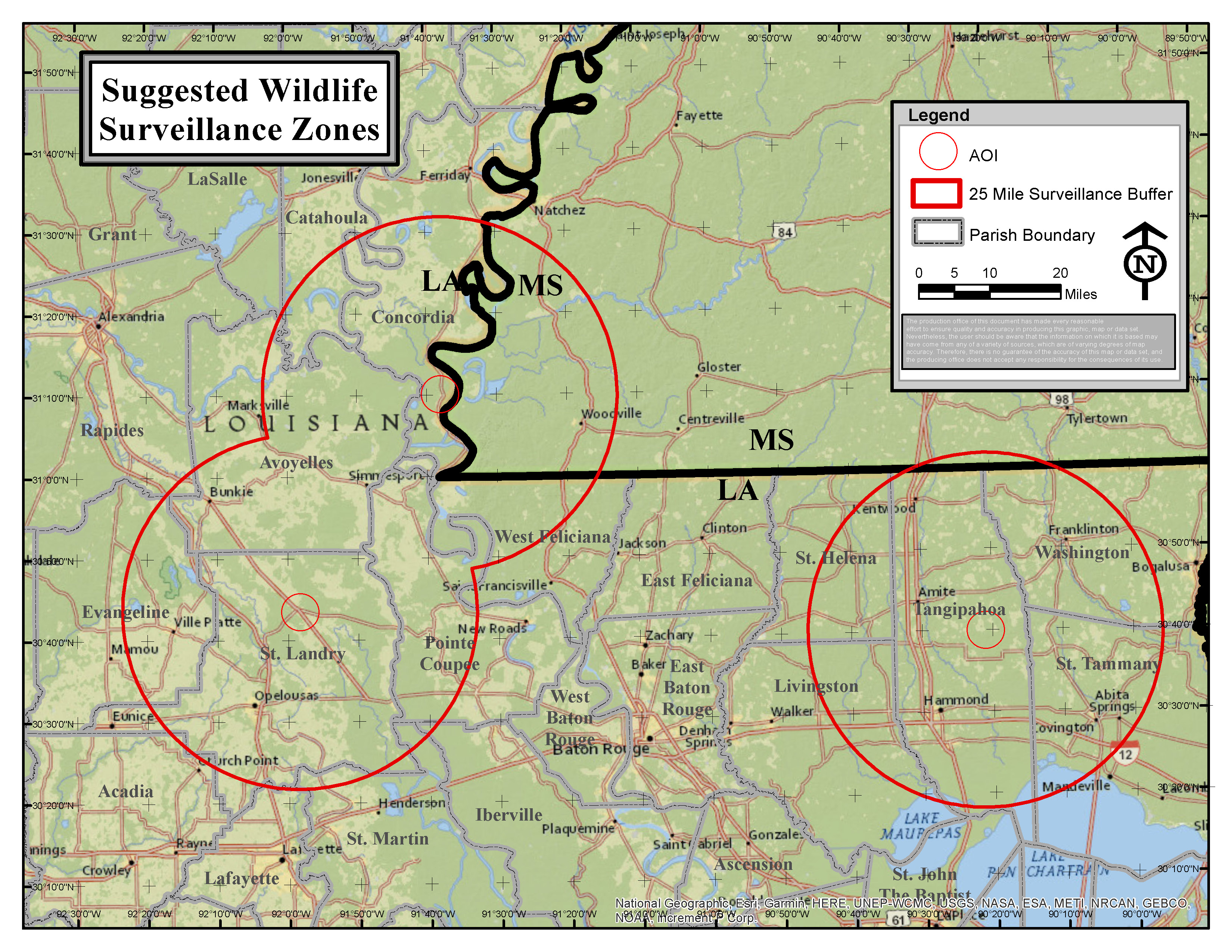CWD surveillance of harvested deer from these areas will be critical in understanding whether or not the native wild herd has been exposed. Early detection is crucial to slowing the spread of the disease. LDWF has conducted statewide surveillance of free-ranging deer since 2002. To date, the only CWD detections in the wild have been collected in Tensas Parish.