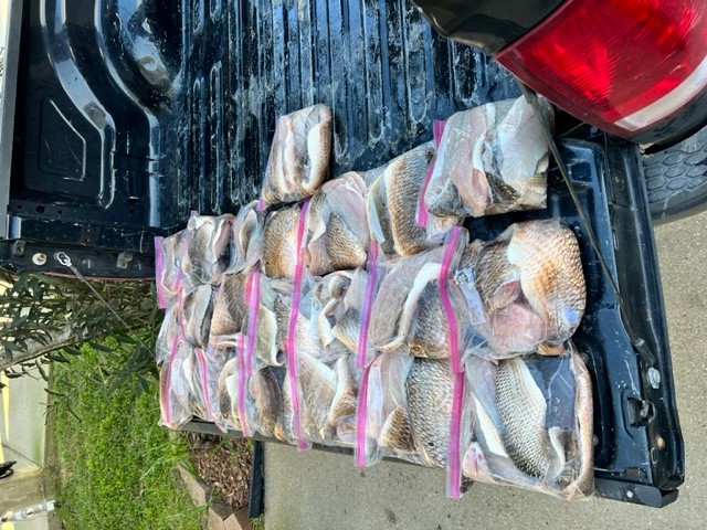 Agents responded the next day while the subjects were at a camp off Hermitage Bayou. Agents found the men in possession of 134 red drum filets putting them in possession of 67 red drum.