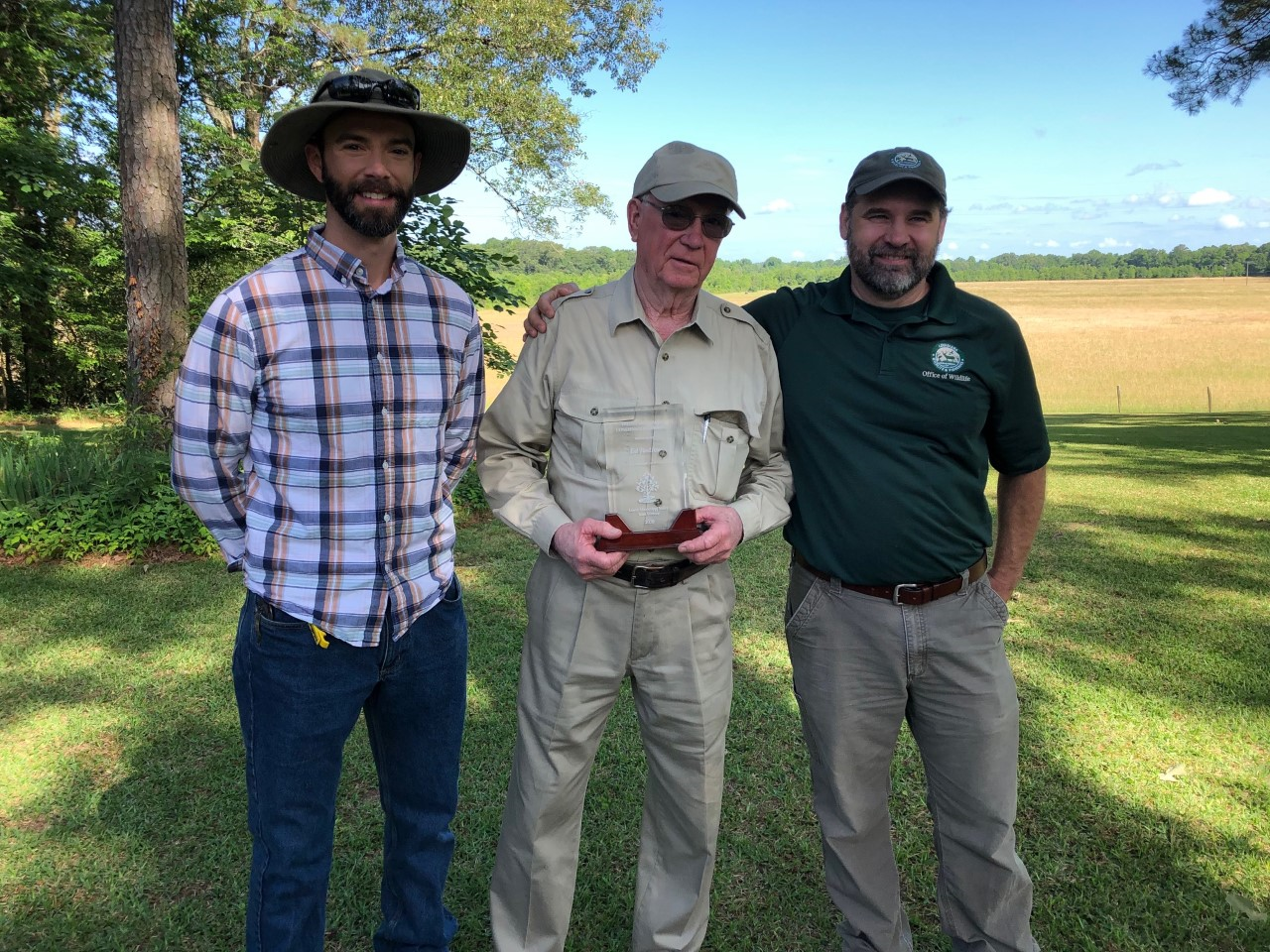 Ed Justice (center) accepts the Lower Mississippi Valley Joint Venture’s 2020 Private Landowner Conservation Champion Award, joined by his son John Justice(left), and John Hanks (right), Louisiana Dept. of Wildlife & Fisheries Biologist Supervisor.