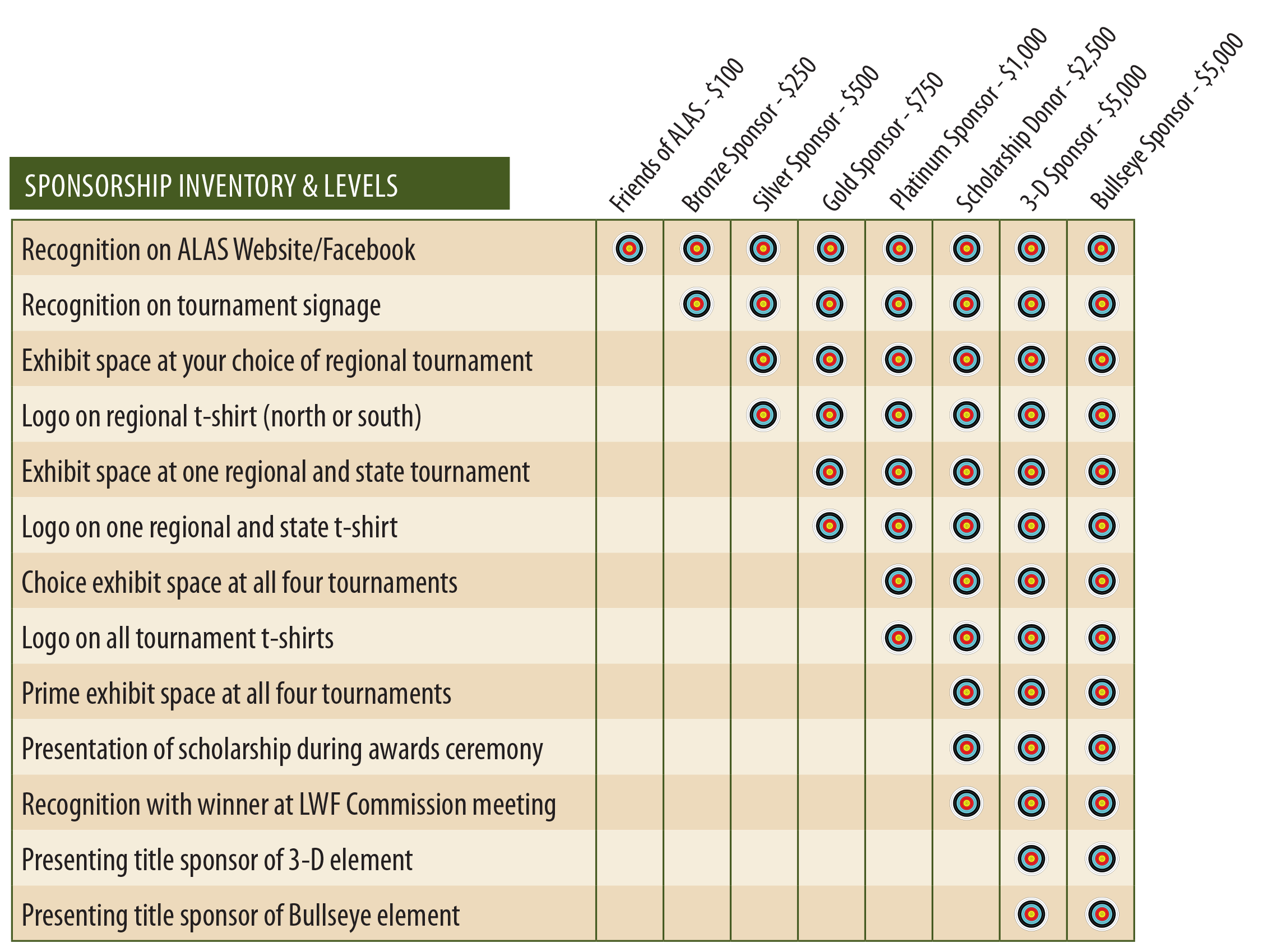 We look forward to partnering with Louisiana companies and organizations that see the value of the ALAS program. Because of our Sponsors, we can award in excess of $30,000 in scholarships to Louisiana archers at the Bullseye and 3D tournaments annually! We have expanded the program and now host multiple tournaments a year, providing additional opportunities for student participation and for our sponsors to promote themselves while supporting a program that benefits our youth. There are numerous levels of sponsorship: