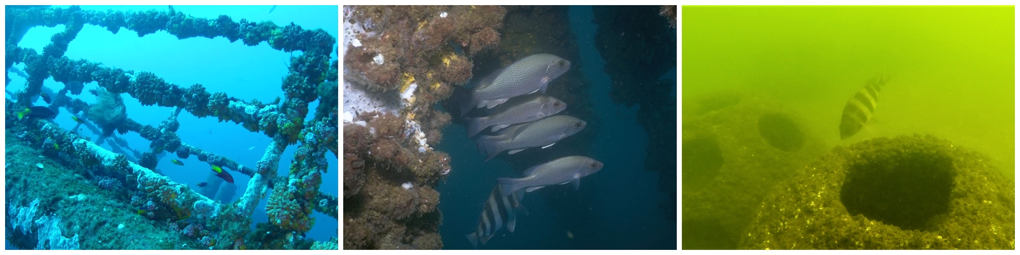 Artificial reefs are manmade objects purposefully placed on the sea floor. Artificial reefs can be created from materials such as cleaned vessels and recycled concrete. These materials are meant to increase the surfaces suitable for encrusting organisms, such as oysters or corals, to attach and grow. The added material also provides refuge to animals that may be vulnerable to predators. Artificial reefs enhance fishing for fishermen and scenery for recreational divers.