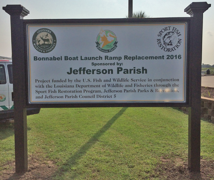 The subrecipient is required to identify the project as having been funded by the federal government as a Sport Fish Restoration Project in conjunction with LDWF via permanent signage no less than 3 feet by 4 feet. The sign must include the Sport Fish Restoration logo and LDWF logo (or some other manner of acknowledgment approved by LDWF). The sign must be maintained throughout the useful life of the project.