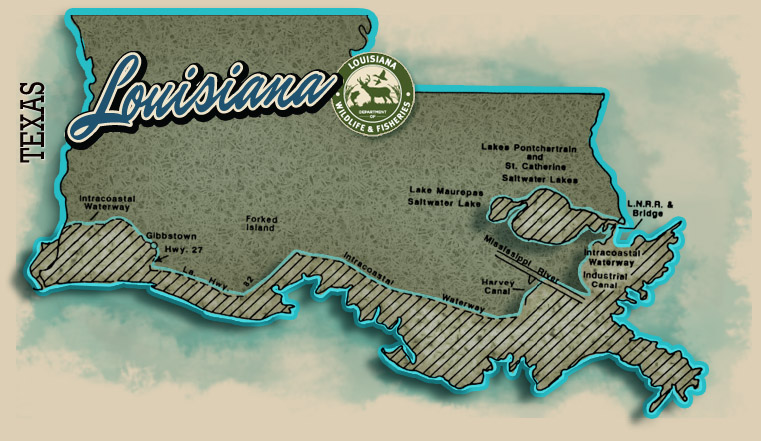 Louisiana's saltwater/freshwater line extends easterly from the Texas state line all the way to the Mississippi state line. Areas north of this line are freshwater. Areas south of this line are saltwater, including Lakes Maurepas, Pontchartrain, and St. Catherine, Chef Menteur Pass (except a 7/10-mile section from Bayou Sauvage south to the Intracoastal Waterway), the Rigolets, Unknown Pass, Pass Manchac, the Intracoastal Waterway, and the portion of the Calcasieu Ship Channel from the Intracoastal Waterway south to the Gulf of America.