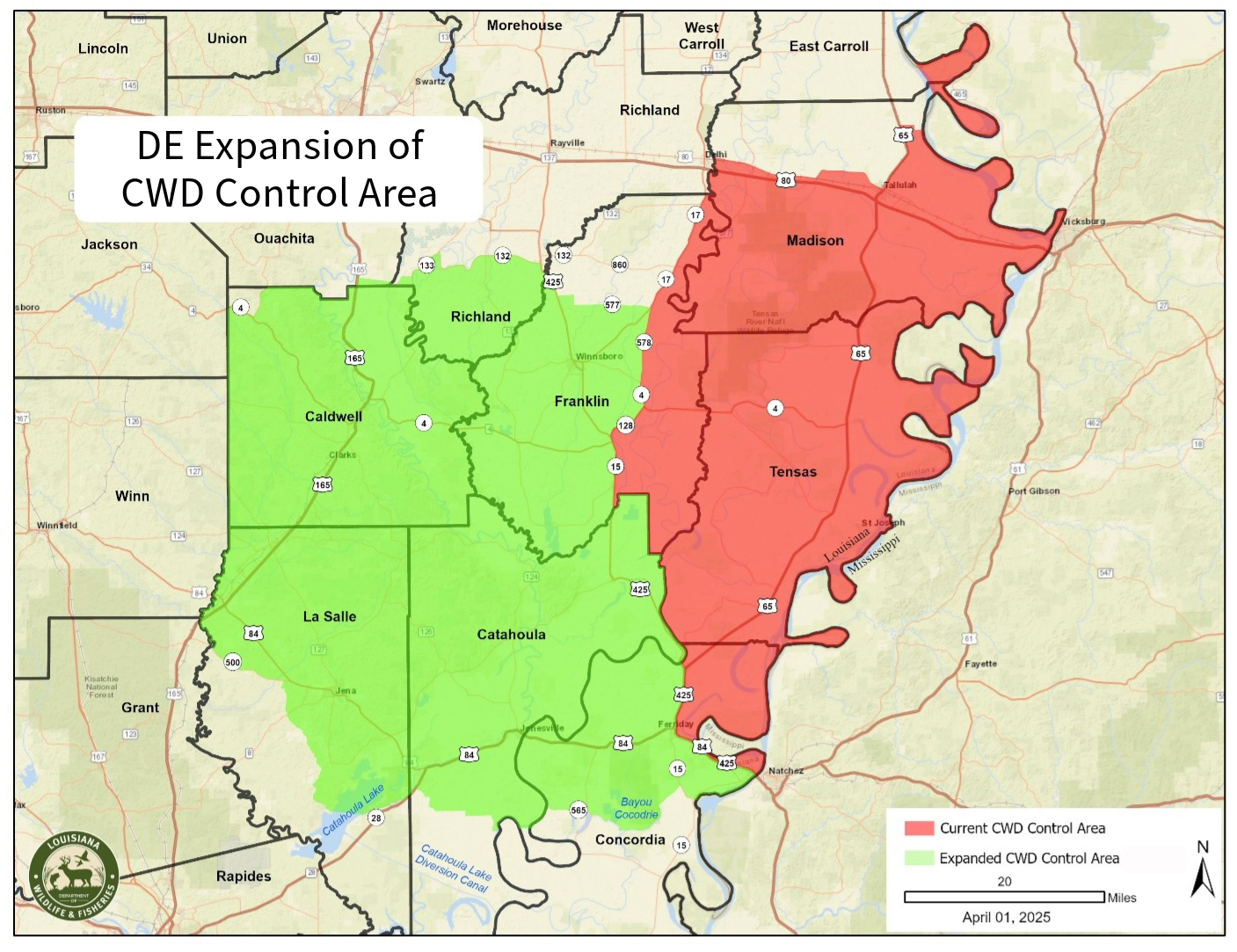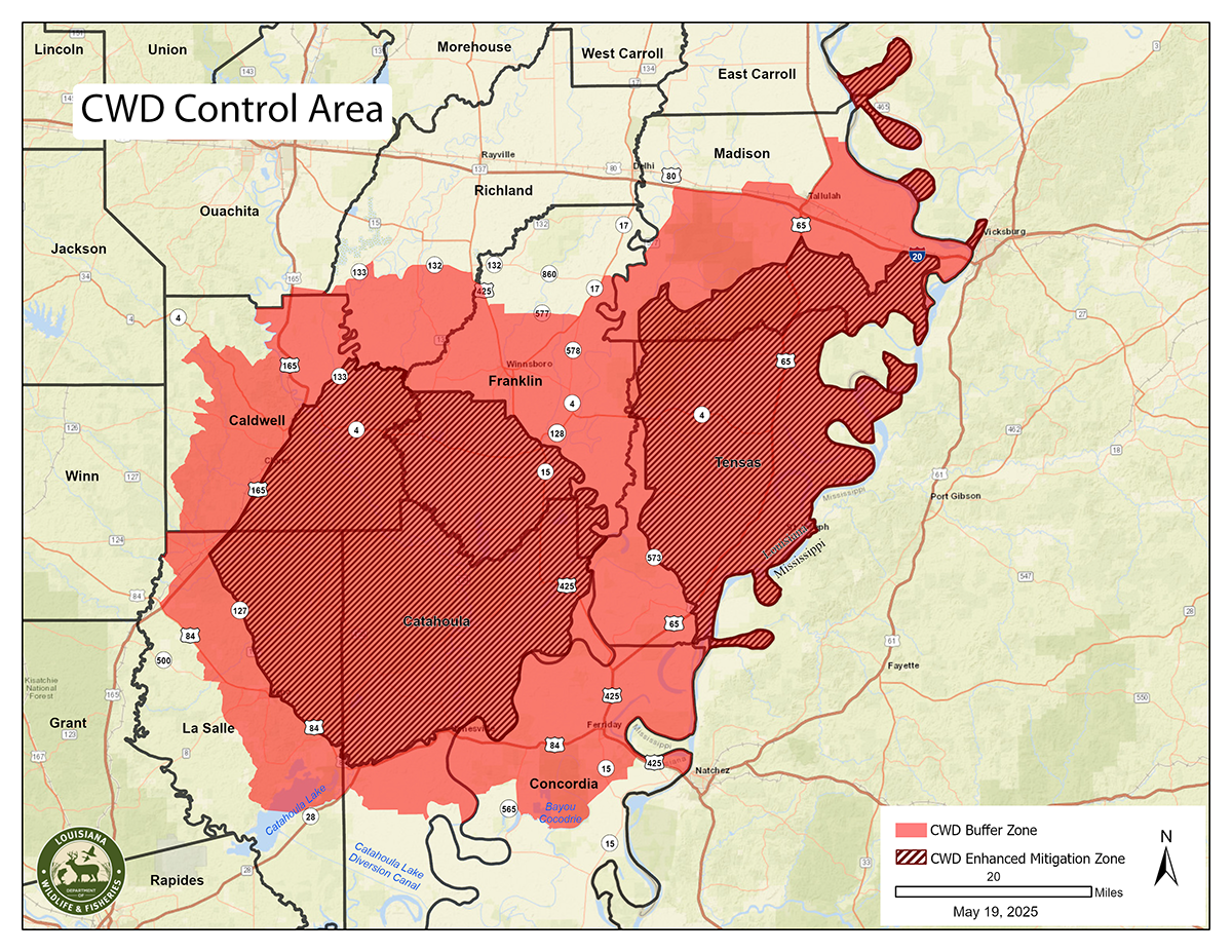 Where CWD is discovered in Louisiana, LDWF will create a CWD control area, the size of which will depend on the location and distribution of infected deer as well as the density, distribution, and seasonal movements of the local deer population. There will be feeding and baiting restrictions in the CWD control area where the disease is found. There also will be movement restrictions on deer carcass parts. Hunters will not be able to bring whole deer out from the CWD control area. They’ll be restricted to deboned meat, meat that is cut and wrapped, quarters with no part of the head and spinal cord, a clean skull plate with antlers, tanned hides, finished taxidermy mounts, cleaned cervid teeth, and the cape, which is the skin of the head and shoulders. Testing of deer harvested within the CWD control area is recommended. LDWF will maintain intensive surveillance in the CWD control area for an indefinite period of time.