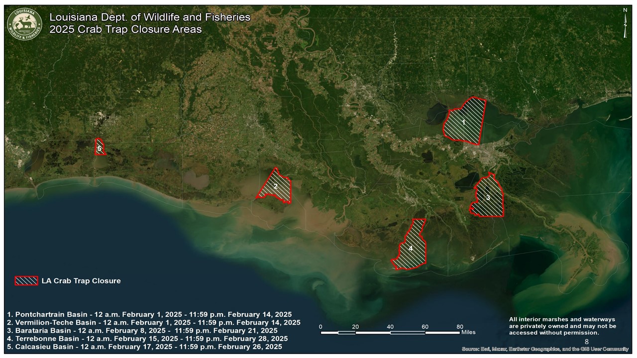 - The second closure will occur in the Vermilion-Teche Basin, all waters east of Marsh Island, from 12:00 a.m. February 2, 2026, through 11:59 p.m. February 15, 2026.