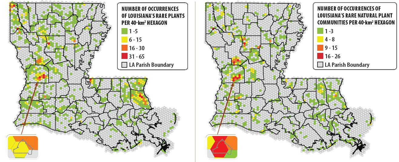 | The greatest concentrations of rare plants in Louisiana are in longleaf pine habitats of St. Tammany and Vernon parishes. The inset shows the Longleaf Pine Flatwoods Savanna Restoration Project site. |