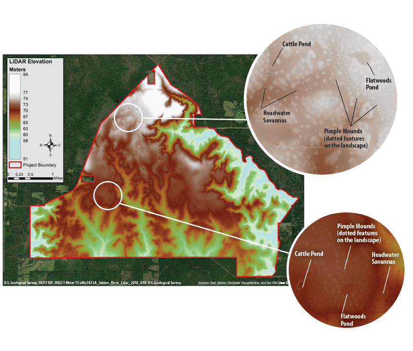 This project site is an ecotone (the edge or transition zone between two habitats or regions), including longleaf pine flatwoods savannas and longleaf pine rolling slope savannas and woodlands. Topographic change in longleaf pine flatwoods savannas of the Western Gulf Coastal Plain are subtle but profound, as they drastically change the vegetative communities.