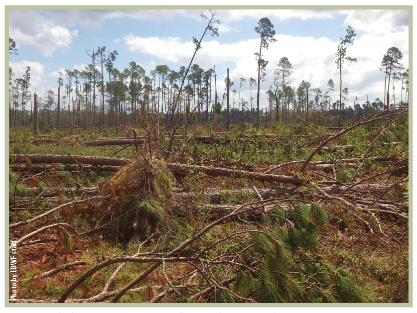 The longleaf pine systems in Louisiana sustained great impacts during the 2020 hurricane season, which caused over $63 million in losses on the Kisatchie National Forest. Approximately 200,000 acres on Kisatchie National Forest received wind damage.