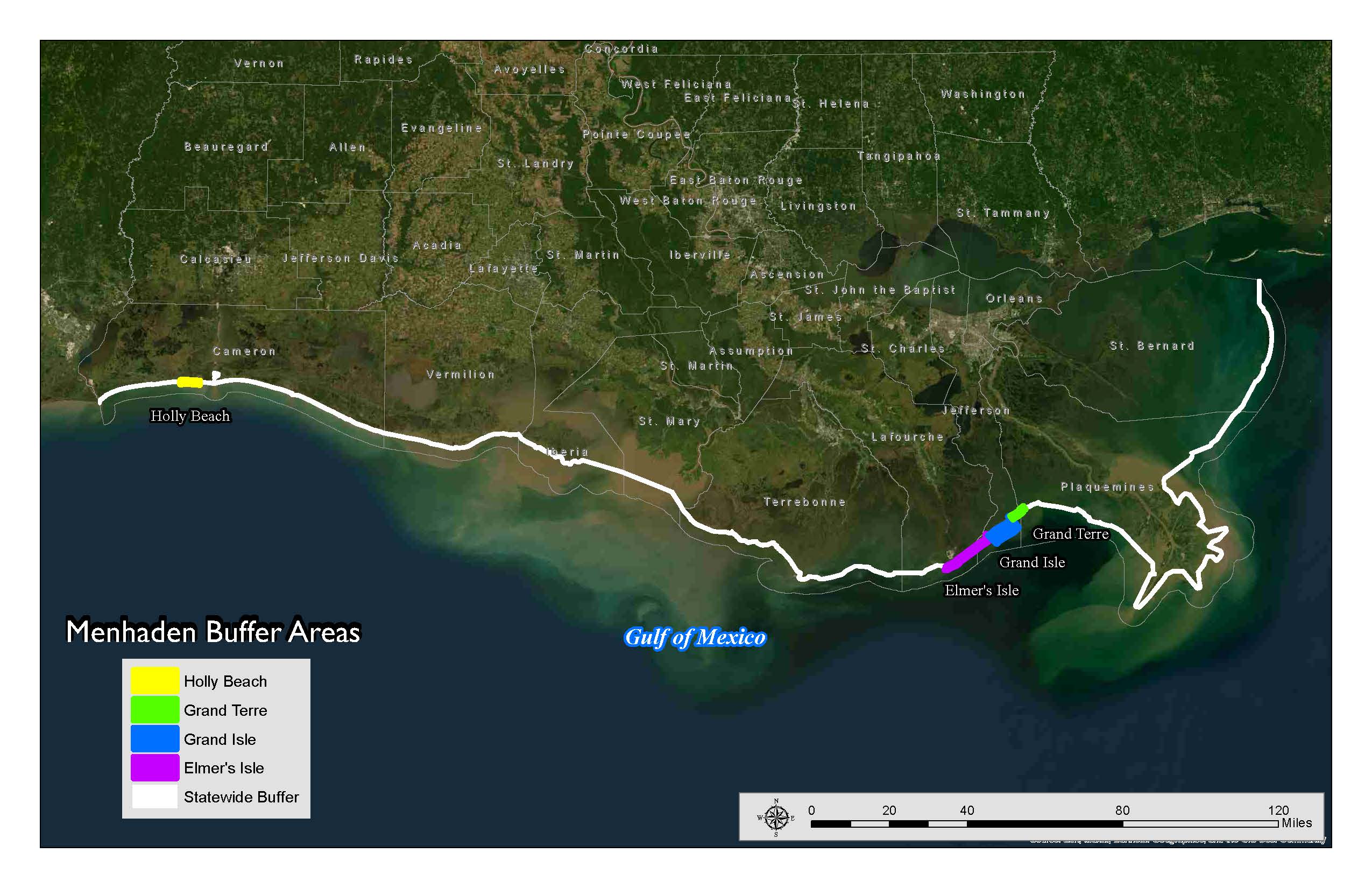 The menhaden fishery has a one-half-mile coastwide buffer zone. There is an extended 1-mile buffer at Grand Terre, Elmers Island, and Holly Beach. Additionally, an extended three-mile buffer is in place at Grand Isle. Below are maps and downloadable files with the coordinates of these buffer zones.