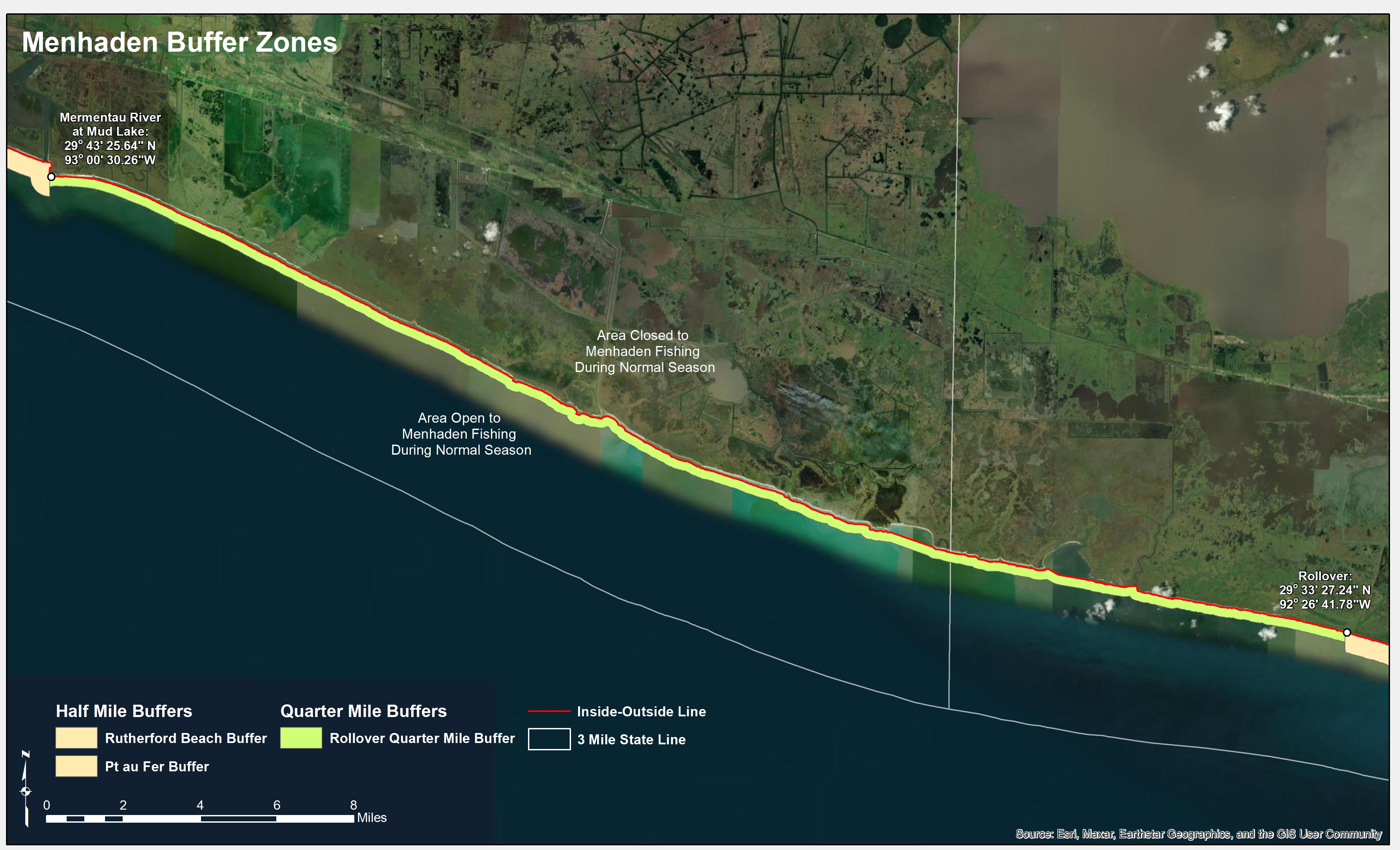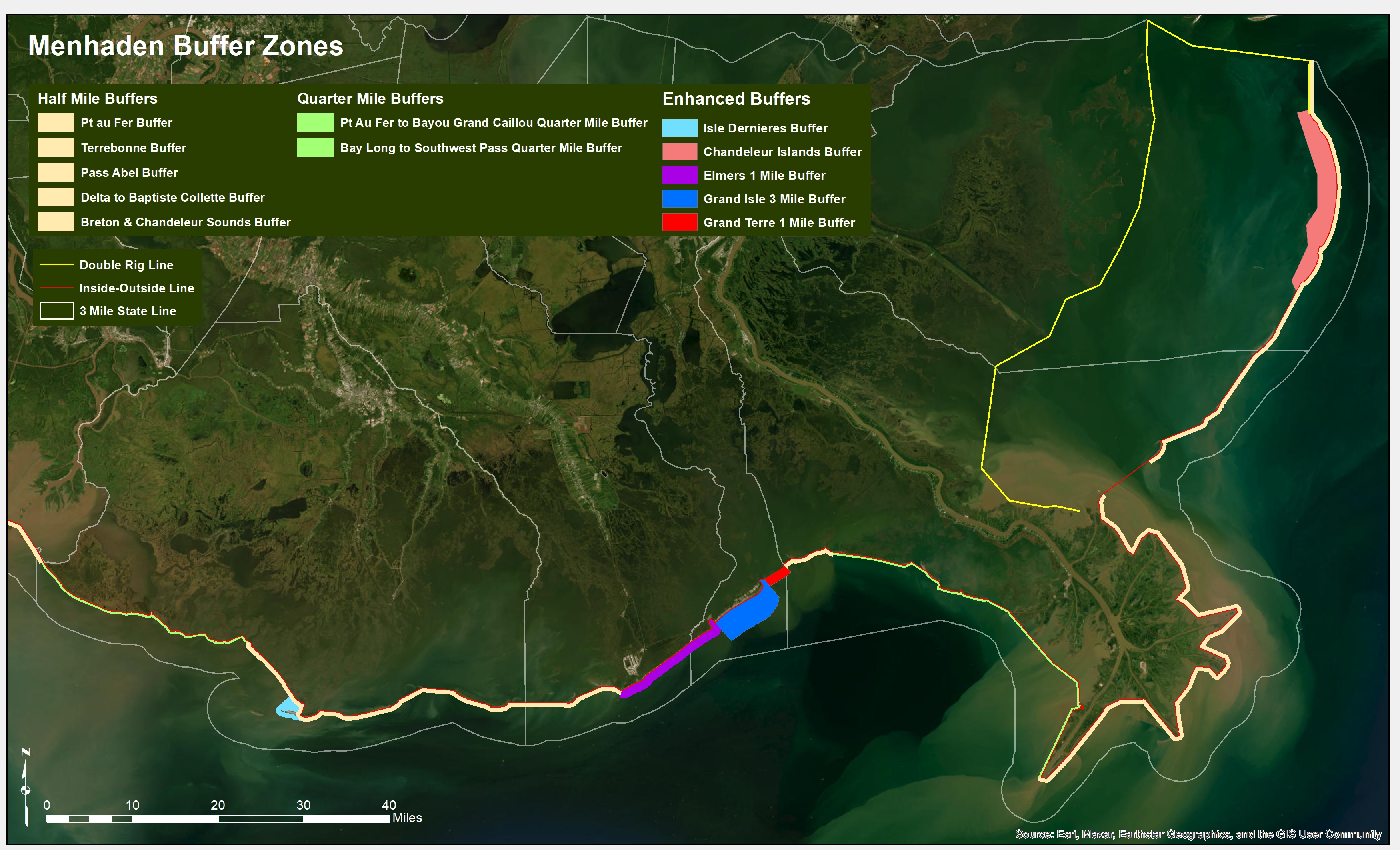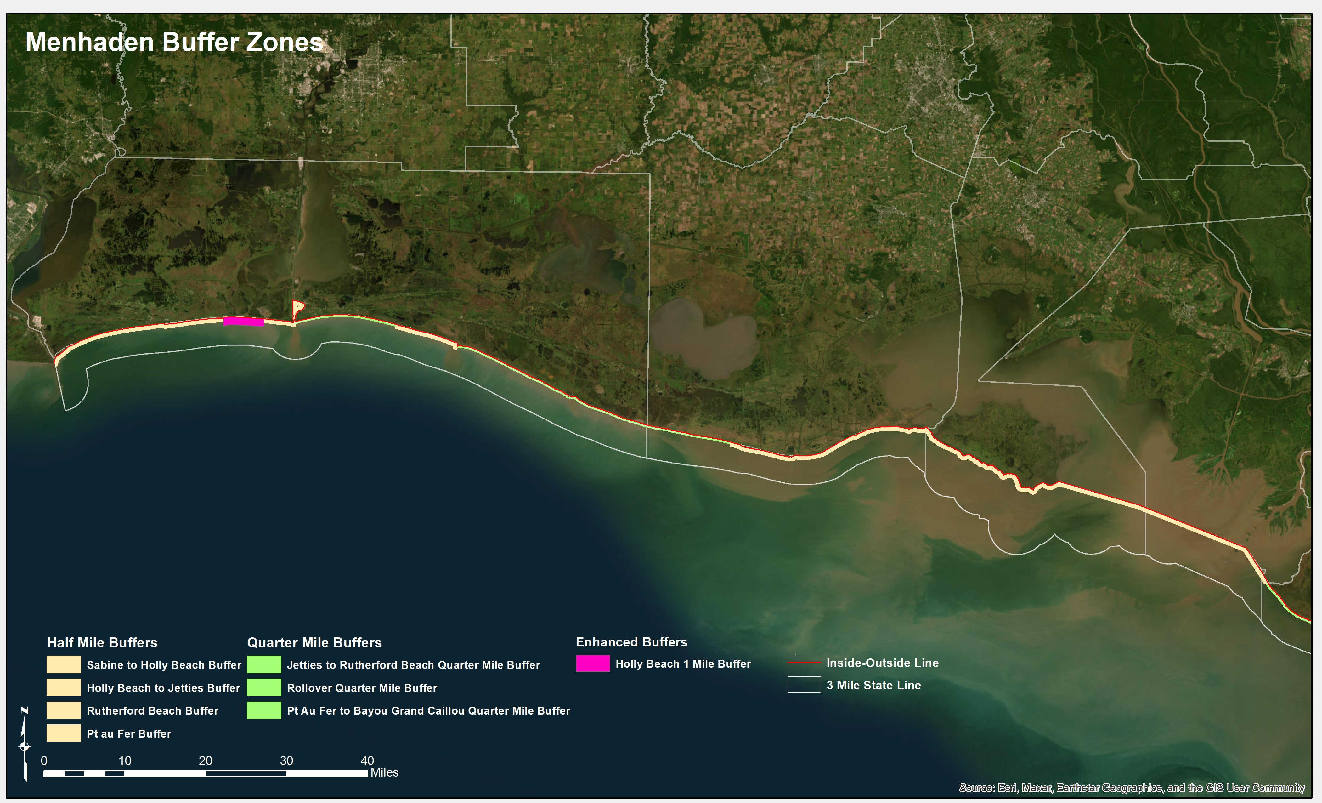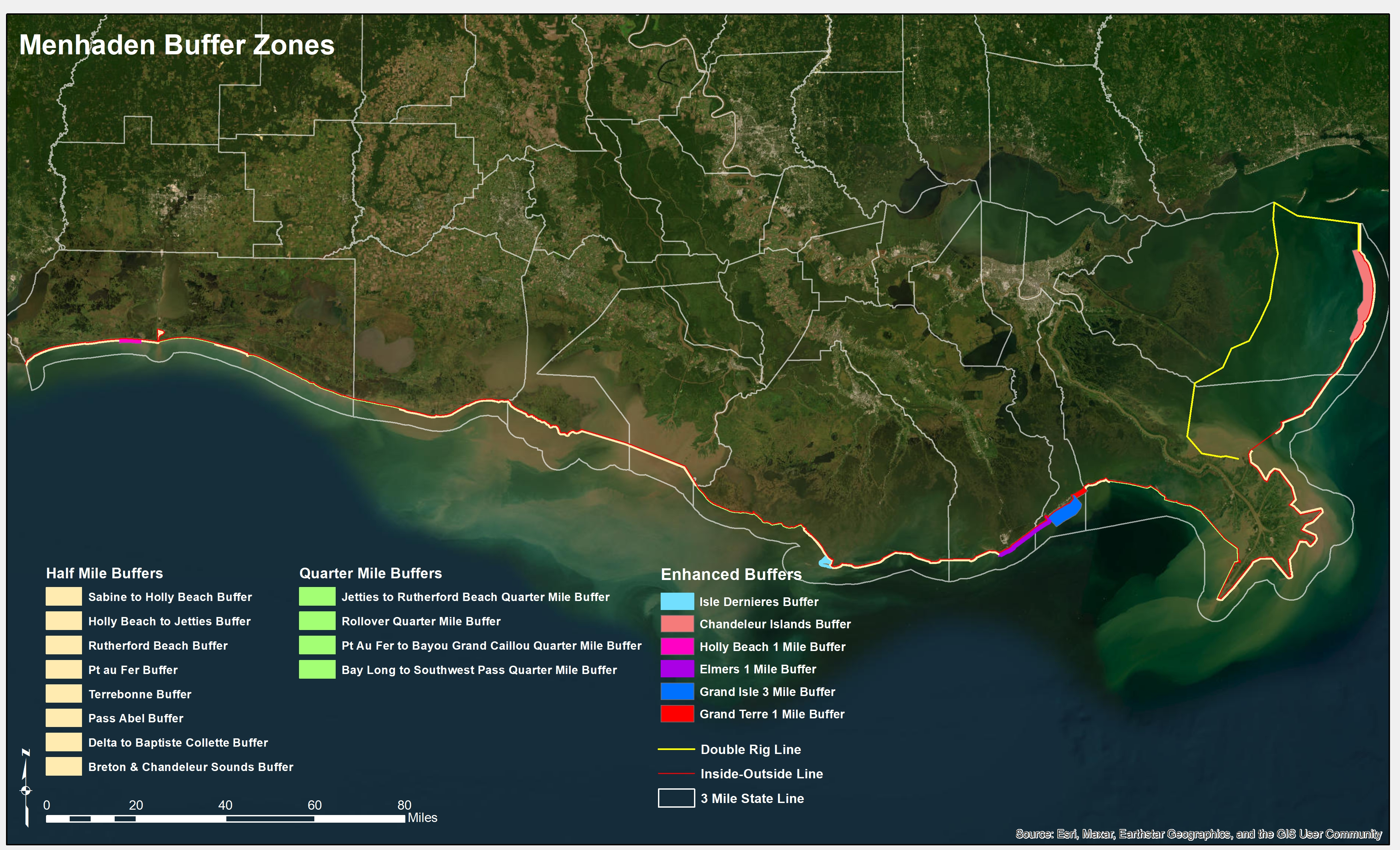 Louisiana Menhaden buffers vary statewide depending on location, see maps below.