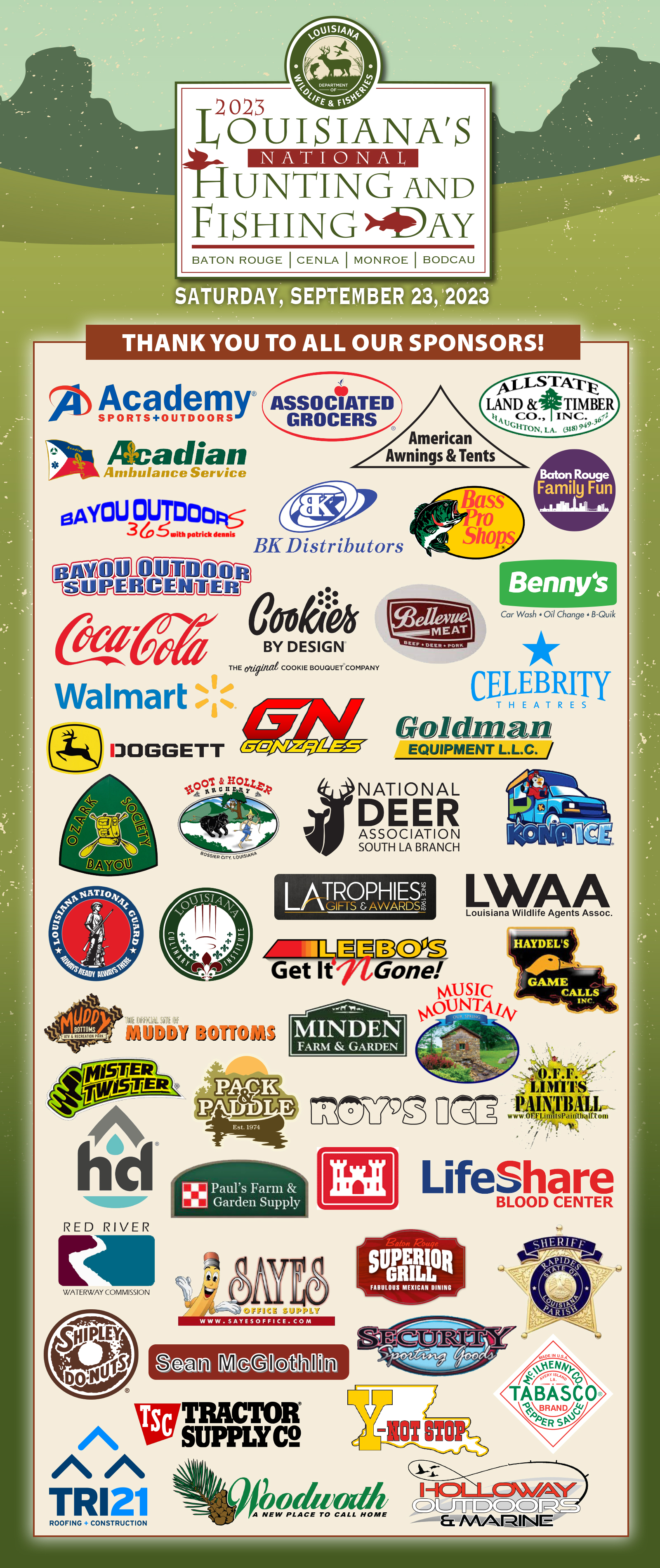 The Louisiana Wildlife and Fisheries Foundation supports Louisiana’s National Hunting and Fishing Day events statewide. Check back here to see our growing list of sponsors who support this event!