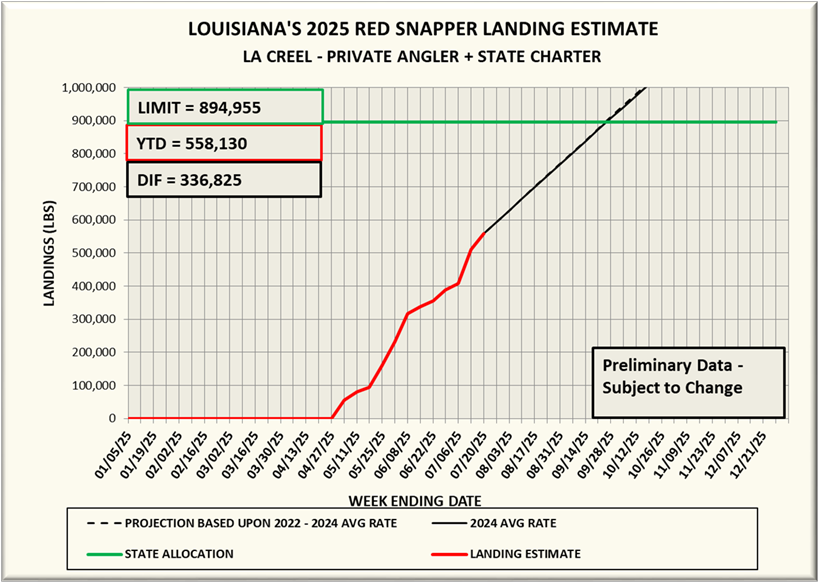 These landing data (in pounds) are preliminary and subject to change. Weather conditions and other factors could impact landing rates and change when landings reach Louisiana’s quota.