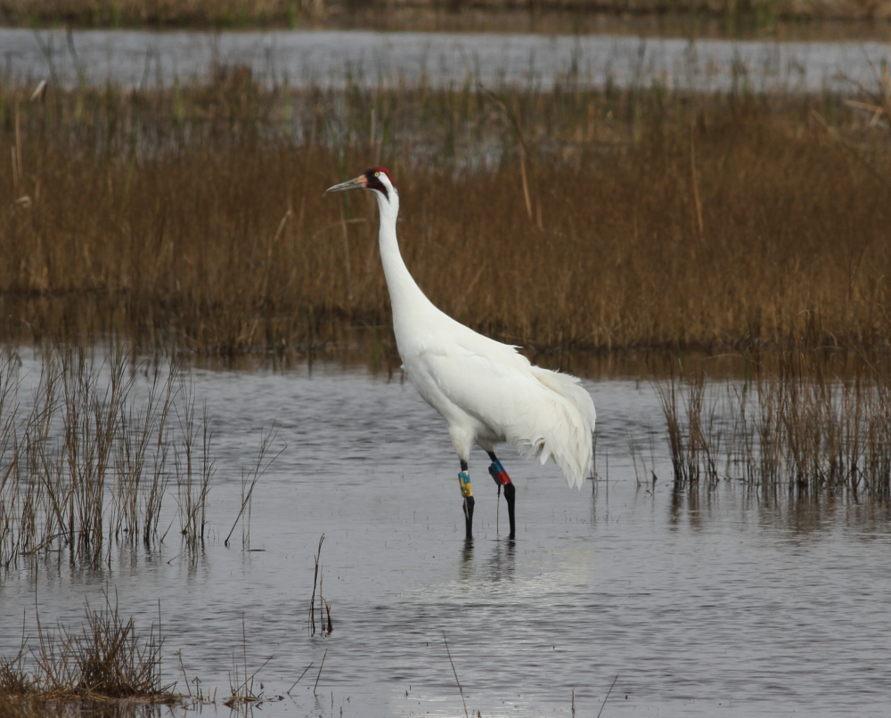 Adult whooping crane with blue over yellow (BY) on the left leg and blue over red (BR) on the right leg.
