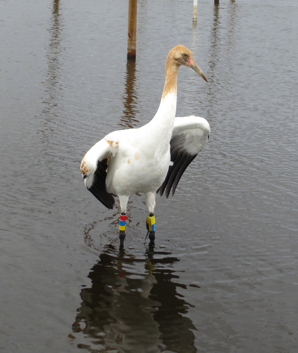 Juvenile whooping crane with yellow over blue (YB) on the left leg and red over blue over yellow (RBY) on the right leg.