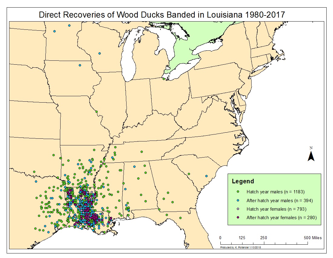 Figure 1 shows the locations of wood ducks banded in Louisiana and recovered during the hunting season immediately following the pre-season banding period each year. These are called direct recoveries. We use direct recoveries to estimate the harvest rate or the proportion of the population harvested by hunters.